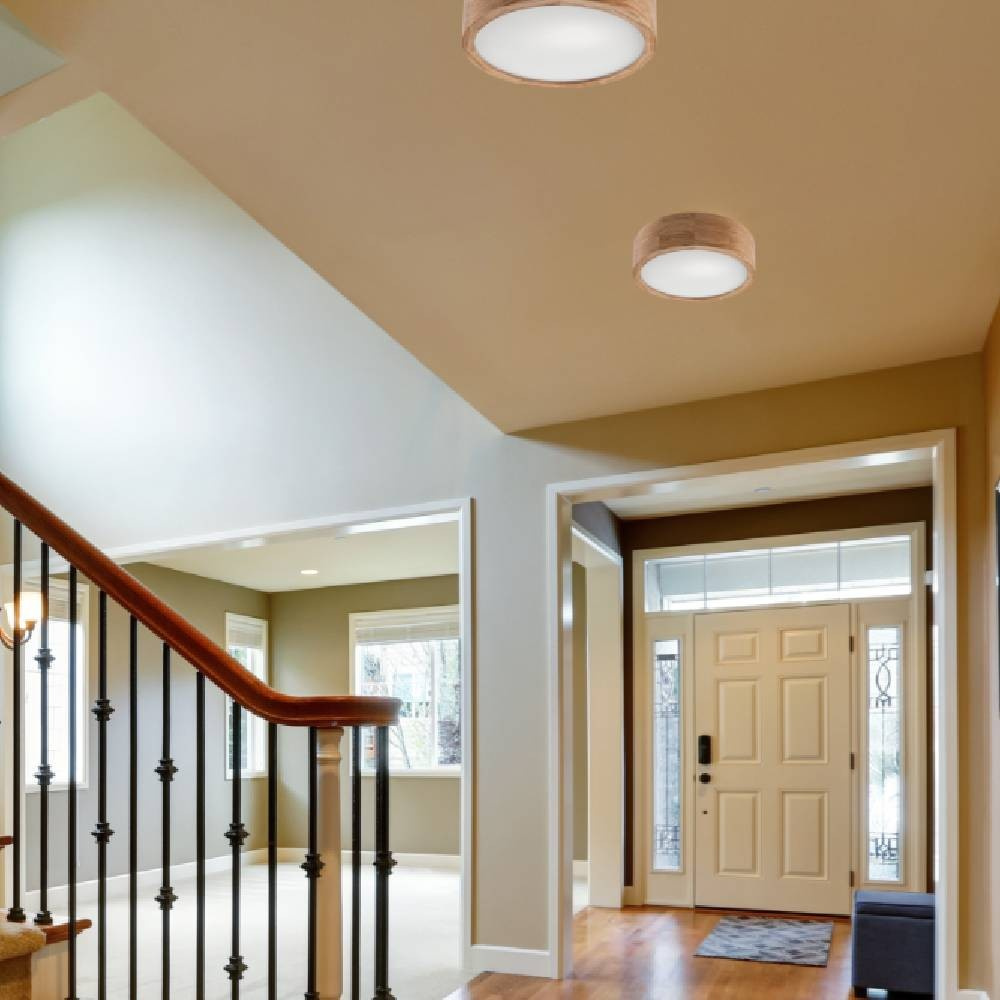 Plafoniera montowana jest bezpośrednio do sufitu lub ściany. Obręcz drewniana przylega całkowicie do podłoża, a wysokość plafonu wynosi 7,7 cm.