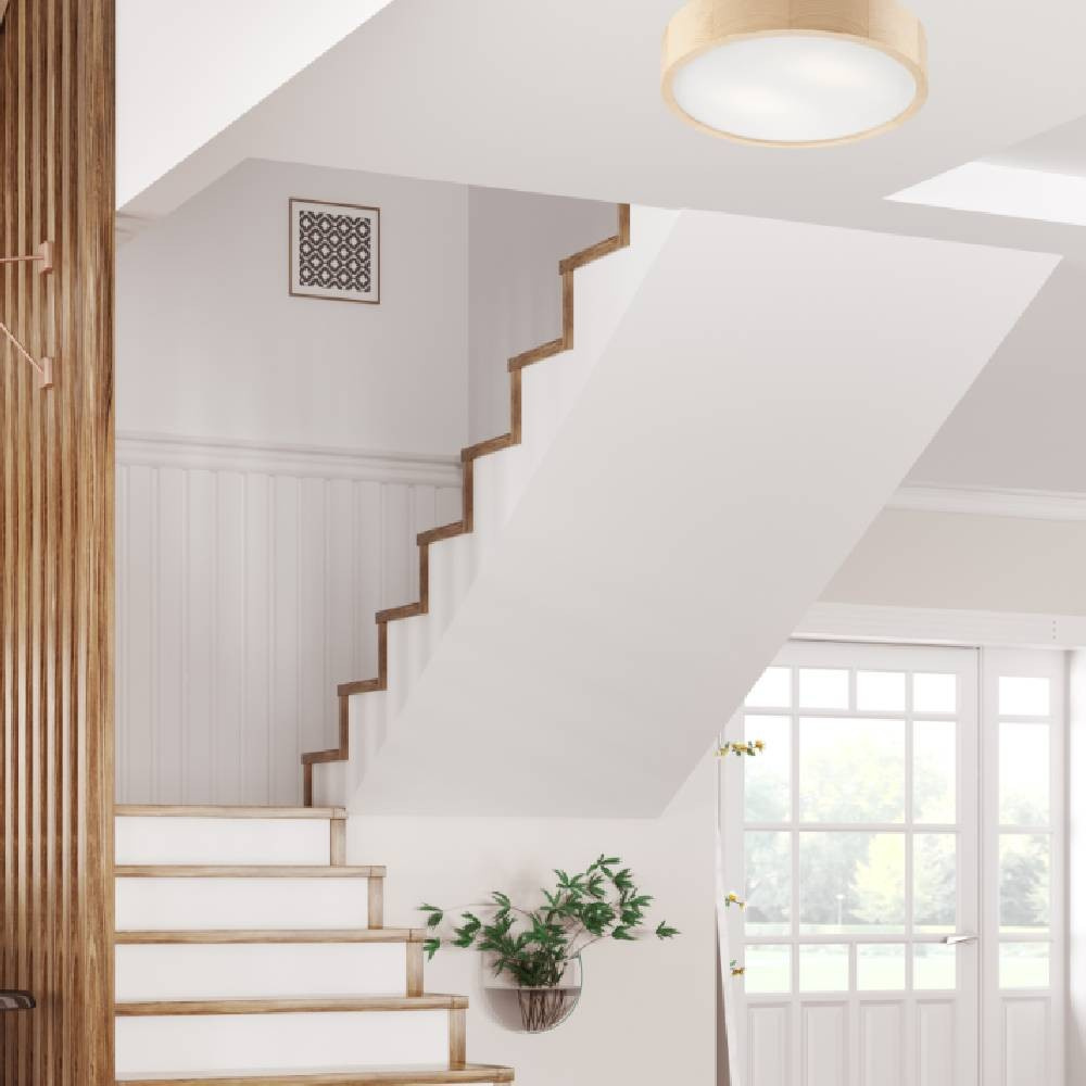 Plafoniera montowana jest bezpośrednio do sufitu lub ściany. Obręcz drewniana przylega całkowicie do podłoża, a wysokość plafonu wynosi 7,7 cm.