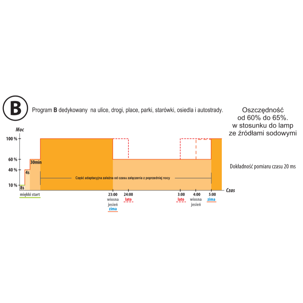Inteligentne żarówki do oświetlania ulic, dróg, parków i starówek. Produkty są zaprogramowane, aby moc strumienia świetlnego adaptowała się do pory dnia i roku (ISA - Inteligentny System Adaptacyjny). W ten sposób można kontrolować zużycie energii przez inteligentną żarówkę. Dodatkowo, oświetlenie nie wymaga przeprojektowania infrastruktury, gdyż może być instalowane w istniejących oprawach. Żarówki LED mogą zapewnić do 70% oszczędności energii. Istnieje możliwość indywidualnego zaprogramowania trybu działania źródła światła. Poniższy schemat ilustruje fabryczny program działania (program B):
