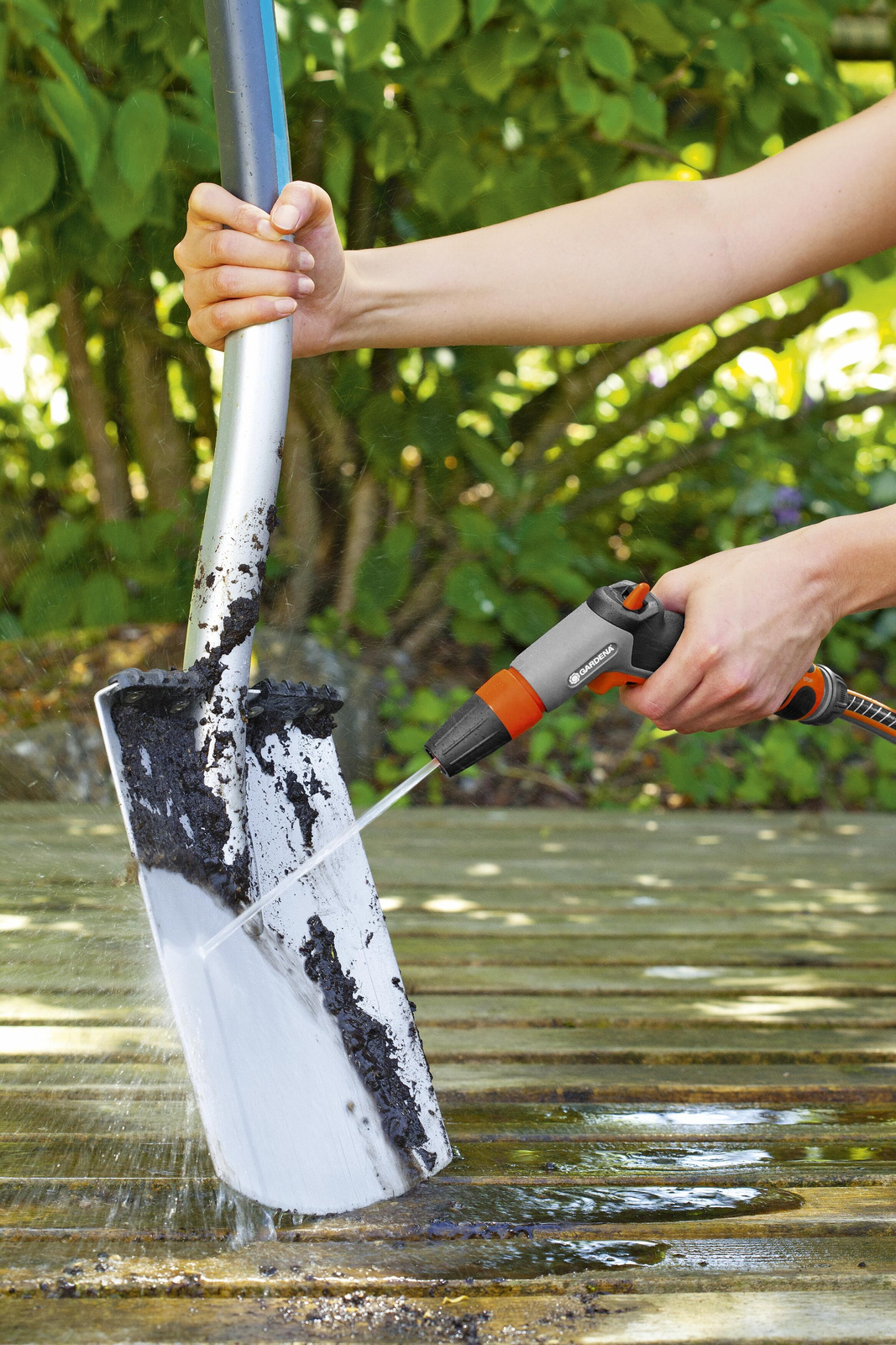 Pistolet zraszający oferuje wiele funkcji, służących podlewaniu. Pistolet jest odporny na mróz. Bezstopniowa regulacja przepływu wody umożliwia dozowanie wymaganej ilości wody. Pierścień ochronny na głowicy zraszacza, który wykonany jest z miękkiego tworzywa sztucznego, zabezpiecza ją przed uszkodzeniem. Pistolet ogrodowy posiada dwa rodzaje strumieni: punktowy, doskonale nadaje się do czyszczenia, a drugi w postaci delikatnej mgiełki, nadający się do zraszania delikatnych roślin. W przypadku dłuższego korzystania ze strumienia wody wyzwalacz impulsowy można zablokować, co uchroni rękę przed zmęczeniem.