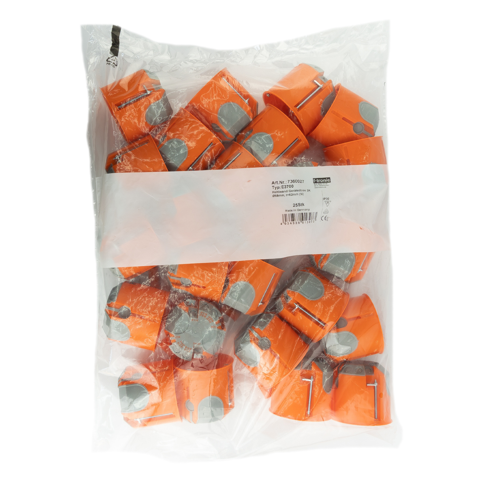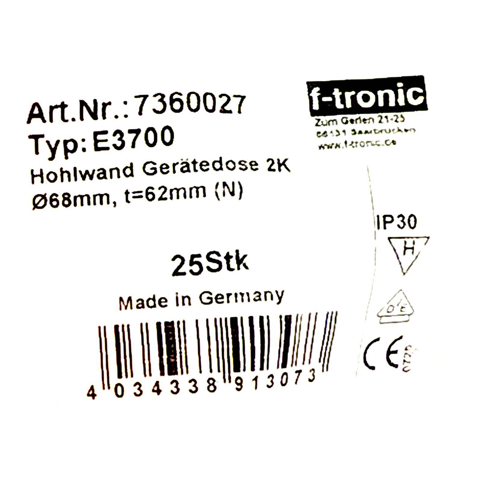 - Wysokiej jakości puszka podtynkowa f-tronic E3700 Ø68 mm wyposażona w 6 przepustów kablowych i 2 przepusty M25. Wersja wiatroszczelna, certyfikowana VDE.