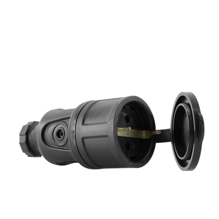 - Wytrzymałe przenośne gniazdo z uziemieniem Schuko IP44. Chroni przed wilgocią i pyłem, gwarantując bezpieczne podłączenie urządzeń w trudnych warunkach. Mocna, czarna obudowa czyni je niezawodnym rozwiązaniem do domu i warsztatu.