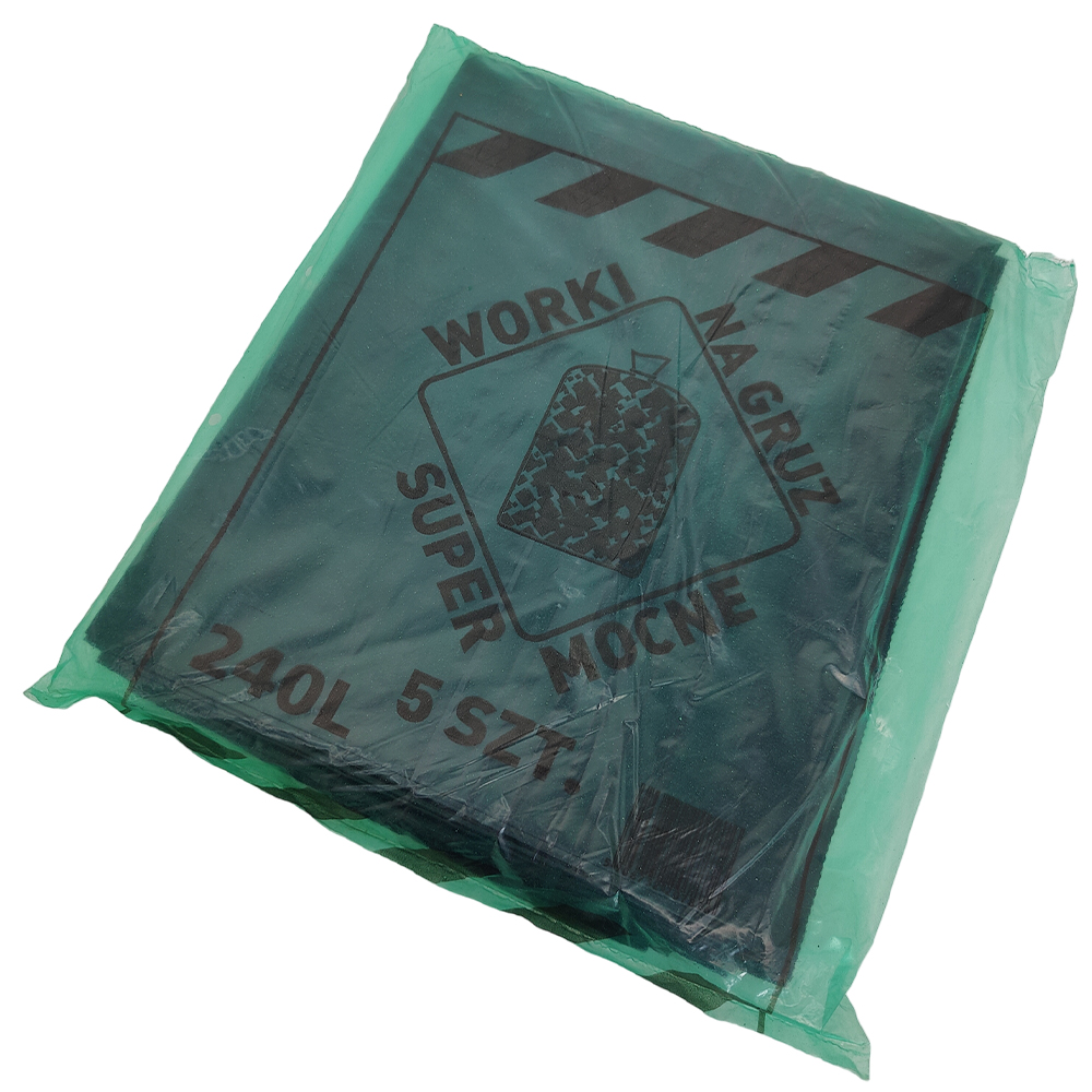 Wytrzymałe, mocne worki na gruz i odpady budowlane marki Wojafko. Dostępne w różnych rozmiarach od 60L do 240L, pakowane po 5 sztuk na opakowanie.