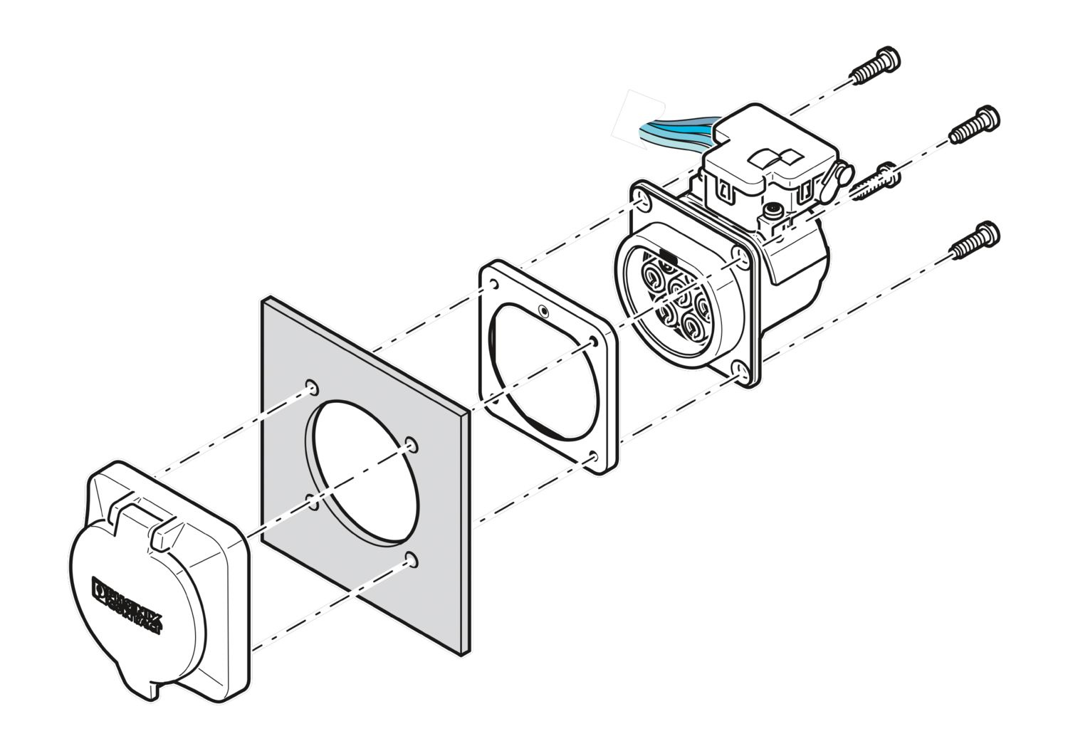 - Pokrywa ochronna charx Typ 2 to kwadratowe akcesorium z mechanizmem samoblokującym, mocowane od przodu na gwint M5, opatrzone wytłoczonym logo PHOENIX CONTACT i przeznaczone do gniazd ładowania, zgodne z normą IEC 62196-2.