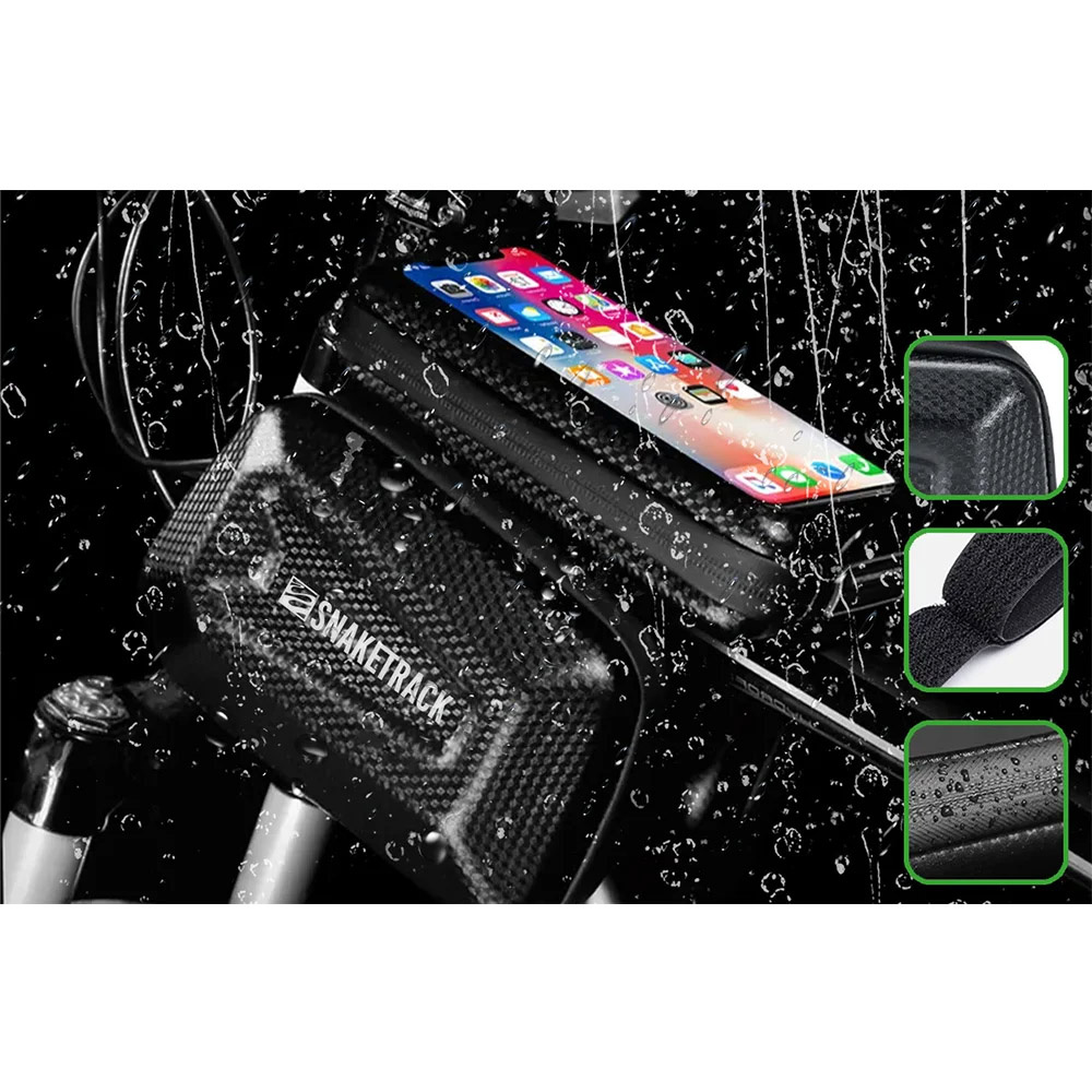 - Potrójna torba rowerowa Snake Track ST04 montowana na ramę. Wodoodporna, pojemność 1,5L – idealna na telefon, narzędzia i akcesoria. Trzy komory, trwałe materiały EVA/PU/TPU, odporna na deszcz i wstrząsy. Doskonała na wycieczki, miasto i trekking.