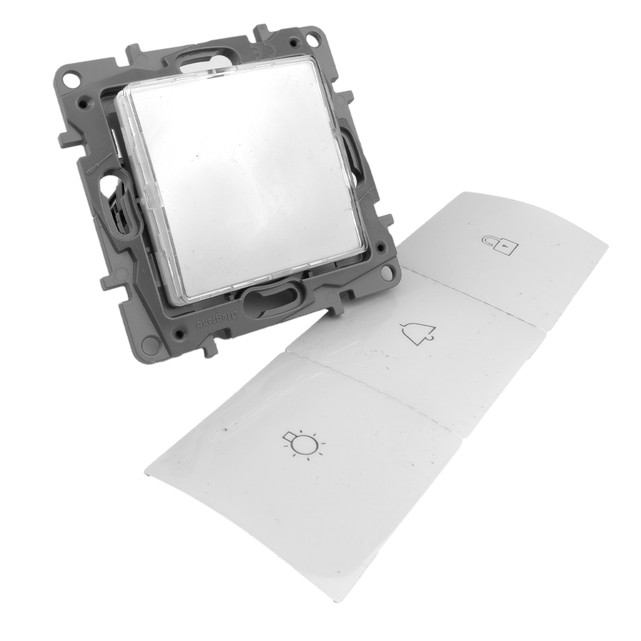 Przycisk z możliwością oznaczenia odpowiednim symbolem. Dodatkowym atutem jest możliwość wyboru koloru białego lub kremowego poprzez odwrócenie etykietki.