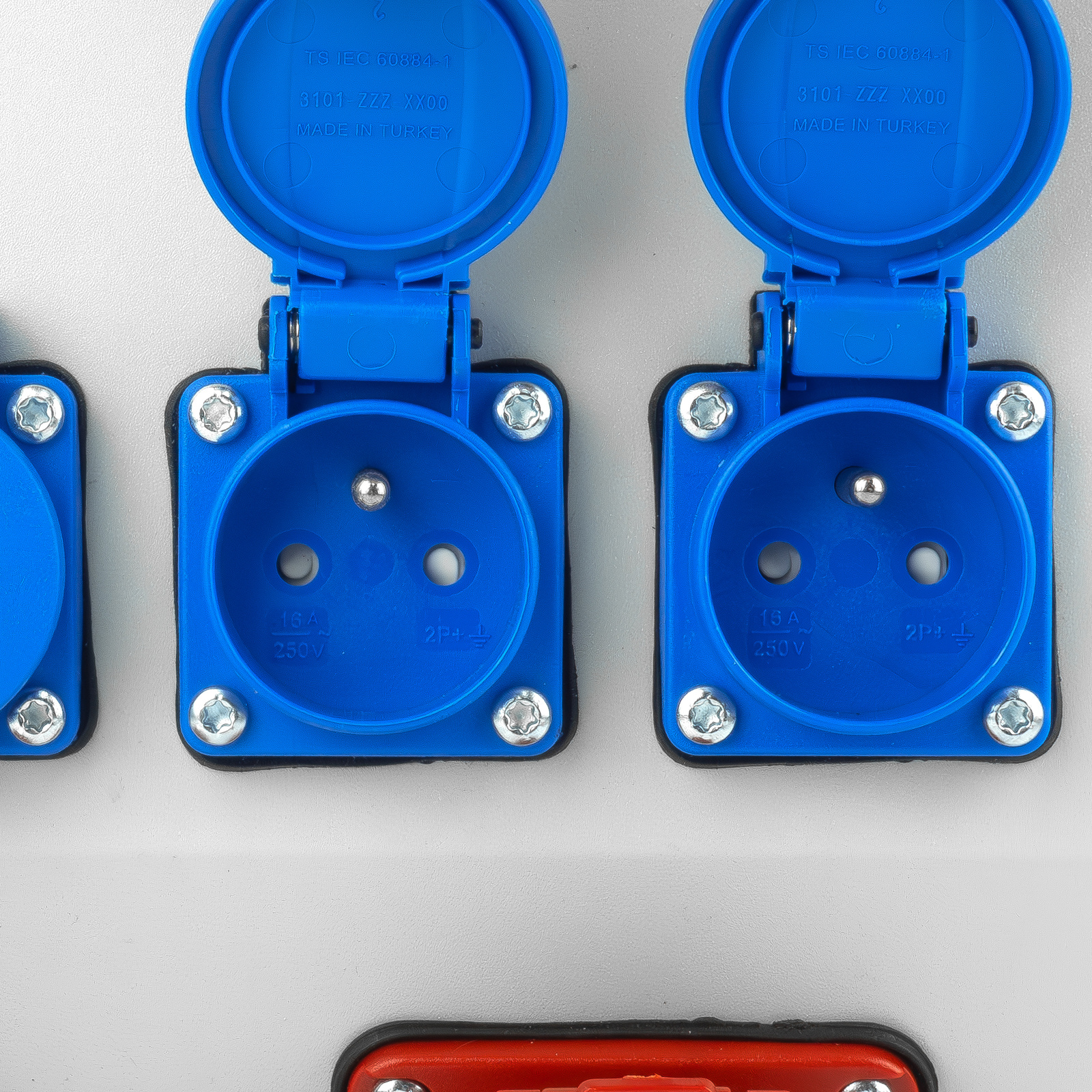 Rozdzielnica została wyposażona w najlepszej jakości gniazda marki Doktorvolt. Wyposażona w dwa gniazda CEE 16A i 32A VDE idealnie nadaje się zarówno do użytku profesjonalnego i domowego. Erbeta posiada klasę szczelności IP44 oraz została wyposażona w cztery gniazda 230V z bolcem ochronnym. Do rozdzielnicy dołączony jest komplet akcesoriów w którego skład wchodzą dławnica, kołki montażowe oraz listwa zaciskowa N oraz PE.