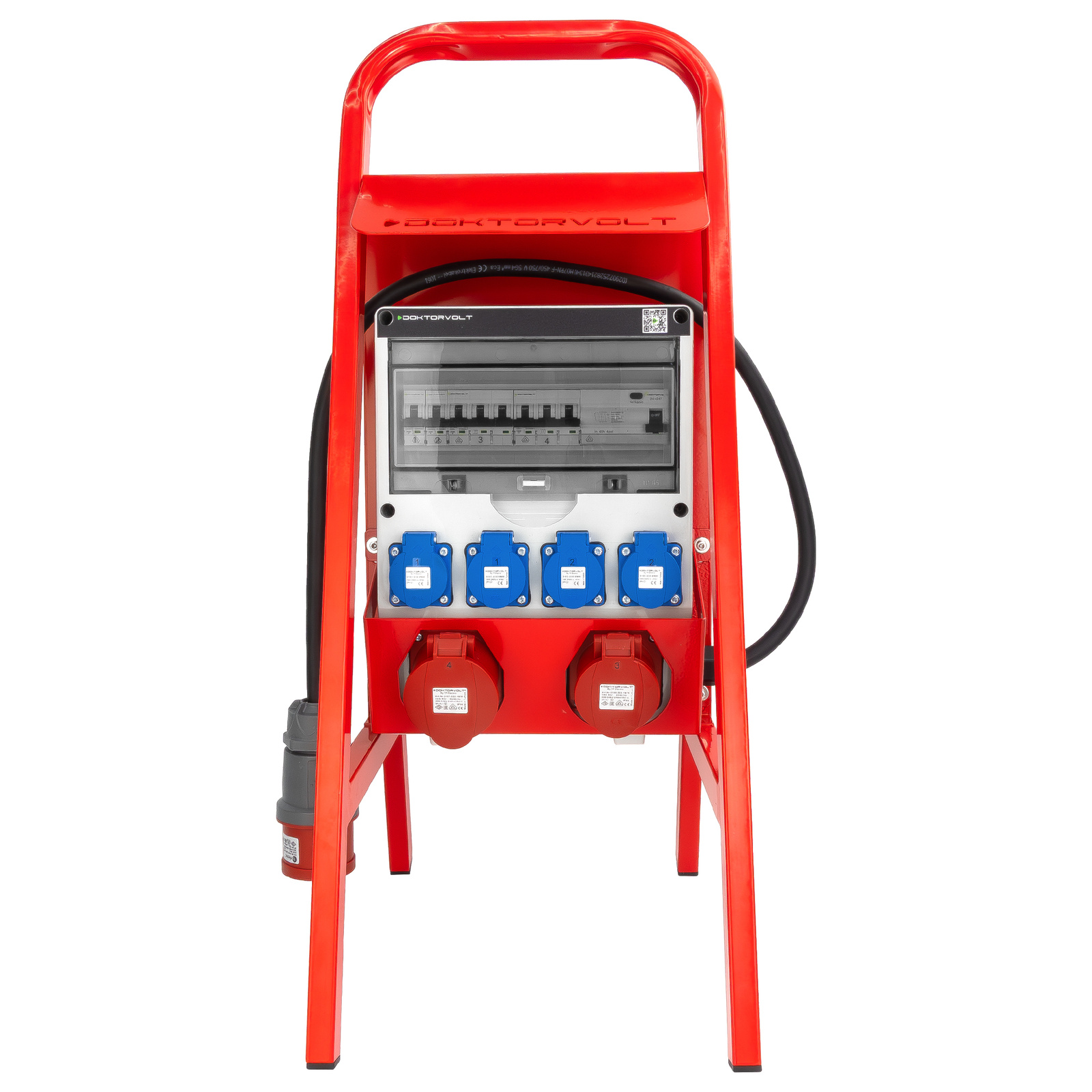 Rozdzielnica budowlana 16A 32A CEE 4x230V na stojaku z daszkiem ochronnym i wtyczką TGD-S/FI z zabezpieczeniami VDE Doktorvolt DV-6074-D