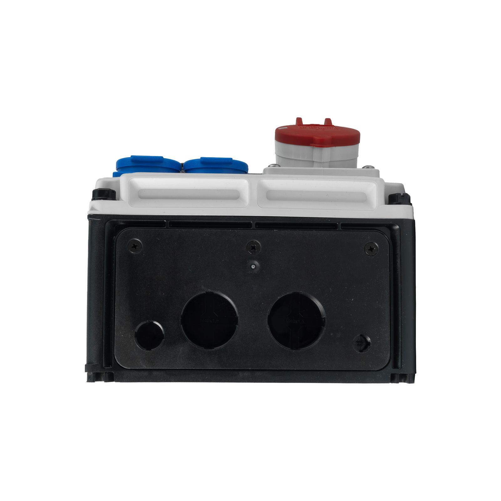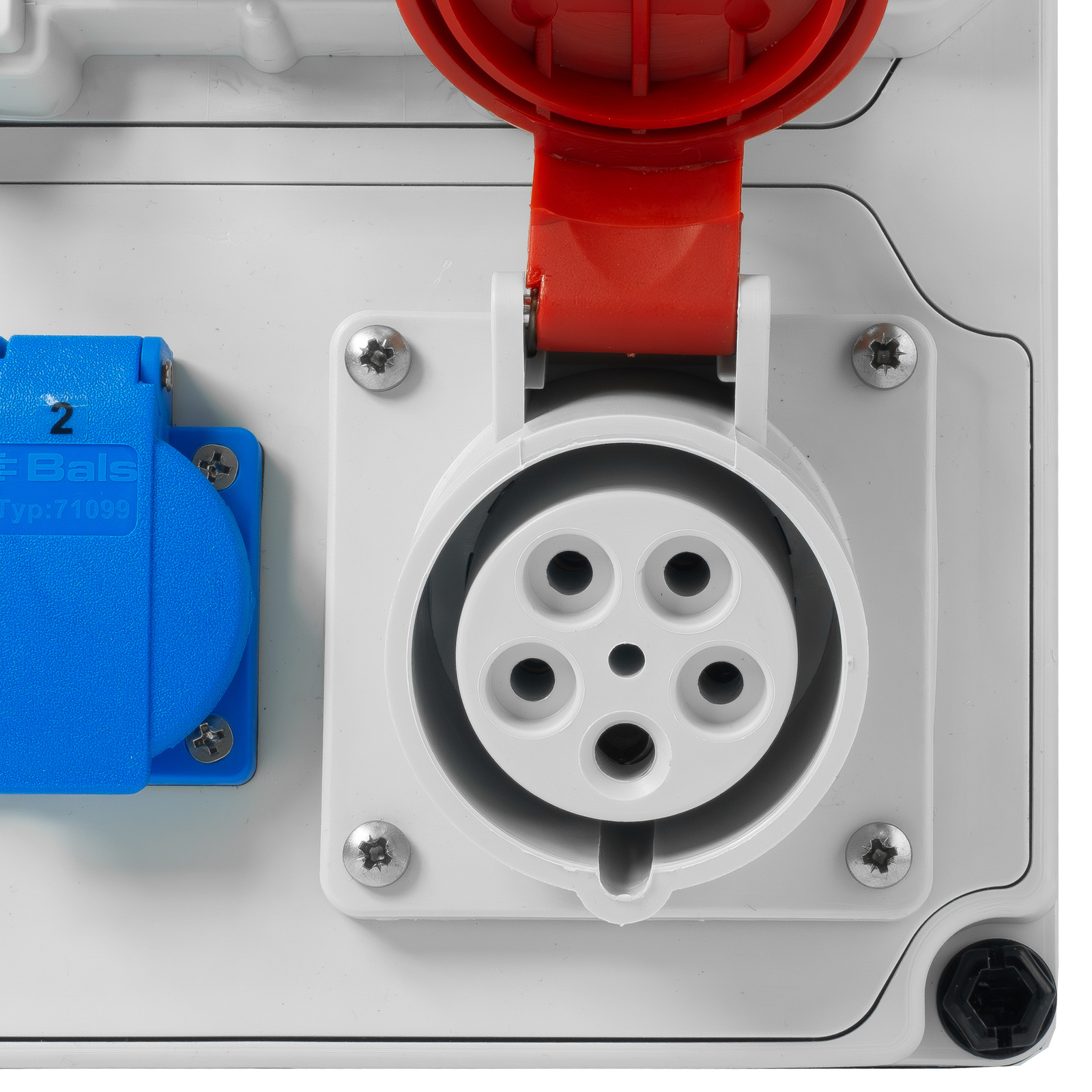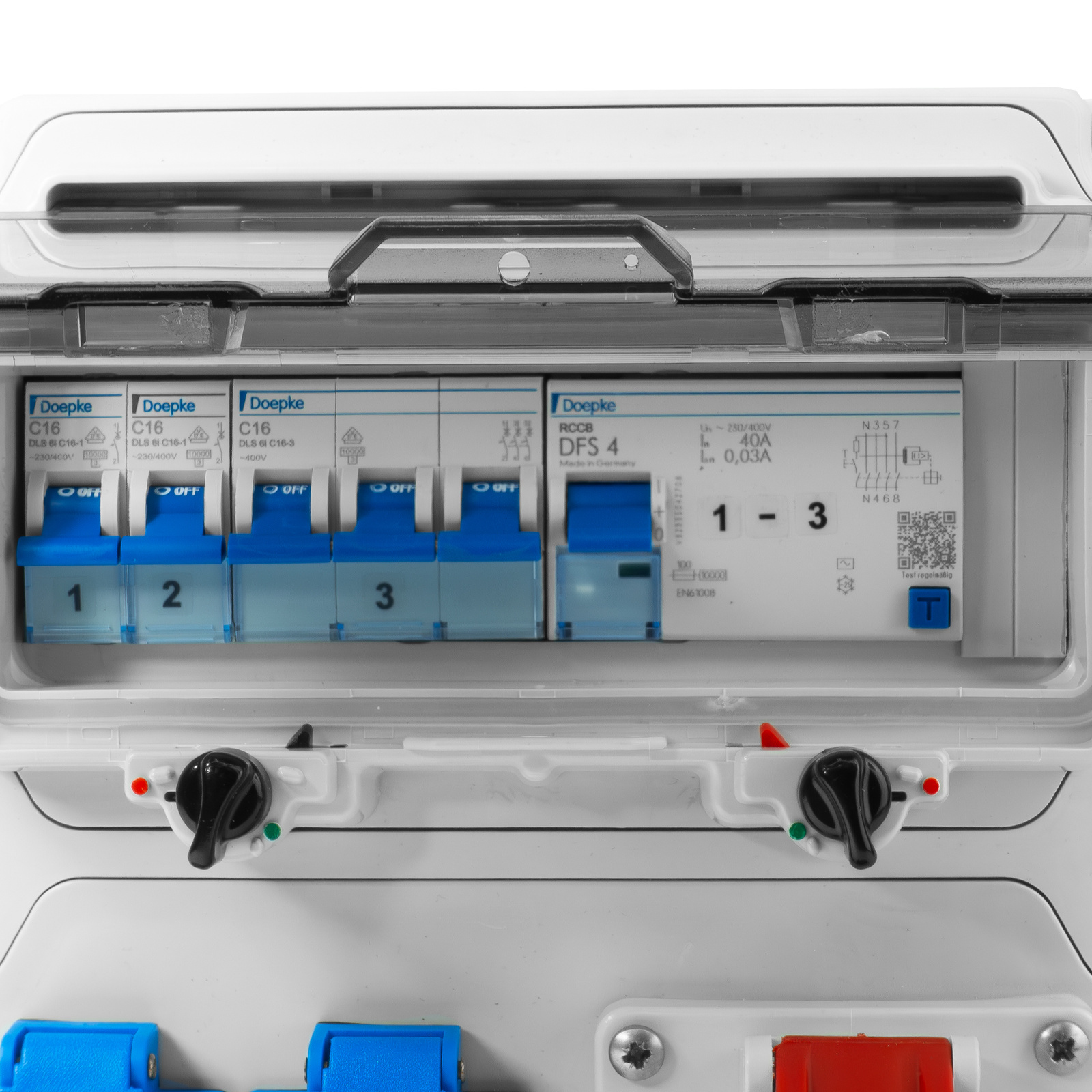 Rozdzielnica posiada jedno 5-pinowe gniazdo CEE 16 A 400 V oraz dwa gniazda Schuko, umożliwiając jednoczesne podłączenie maszyn trójfazowych i elektronarzędzi jednofazowych.