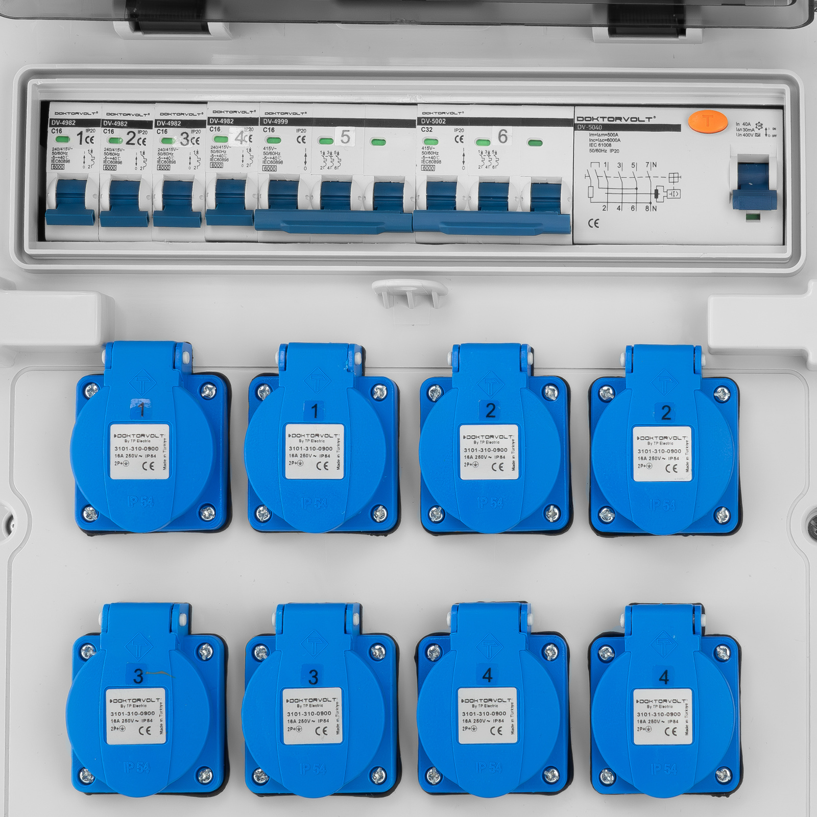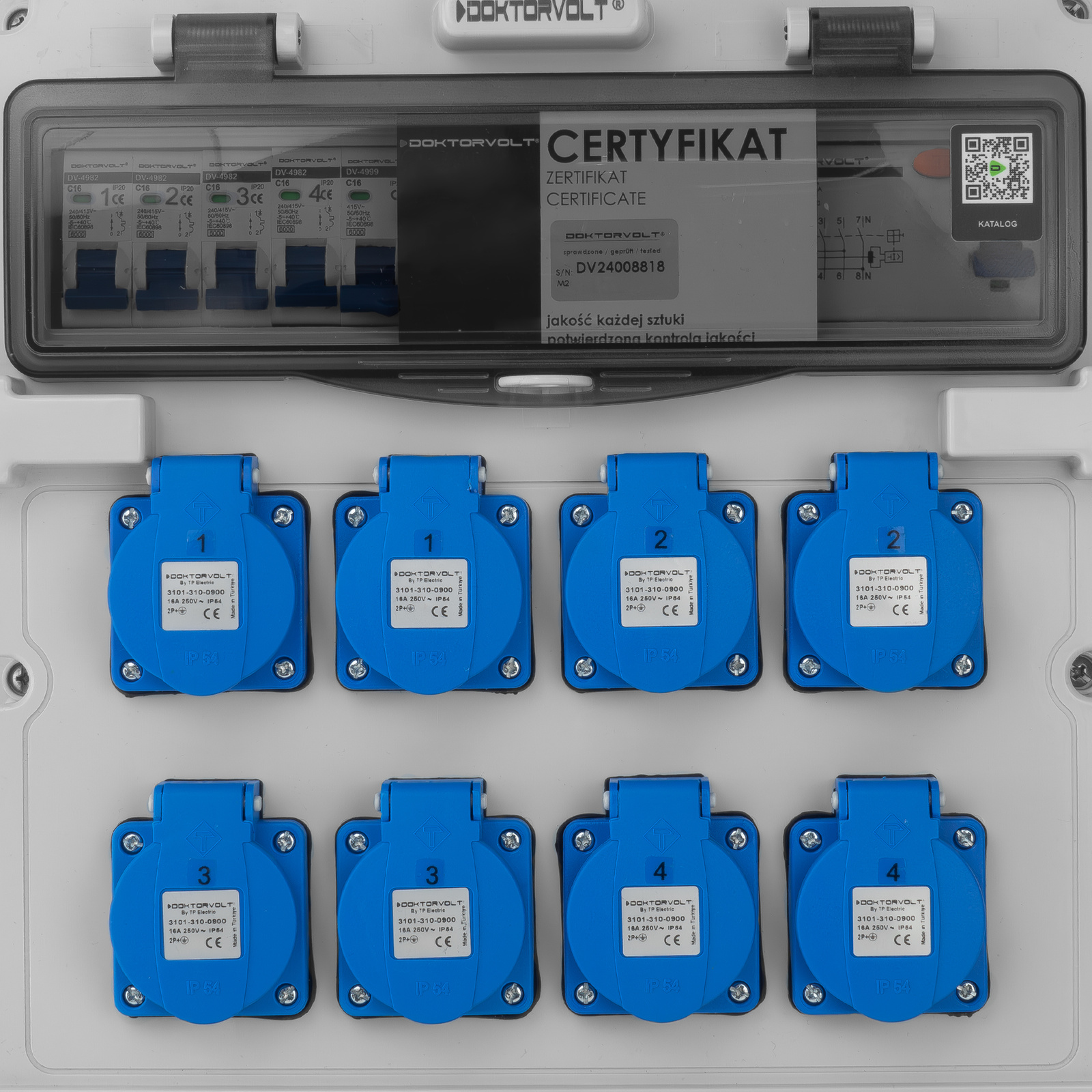 • Rozdzielnica elektryczna DV-5022-D 2x16A 32A/8 x 230V 16A z zabezpieczeniami IP44 gniazda Doktorvolt - Obudowa rozdzielnicy jest lekka, a jednocześnie odporna na promieniowanie UV, co zabezpiecza konstrukcję przed degradacją pod wpływem słońca.