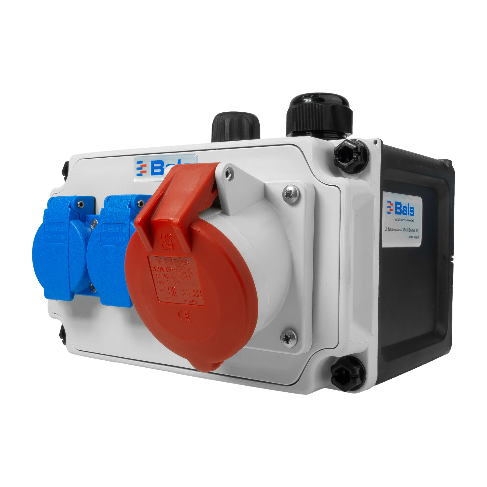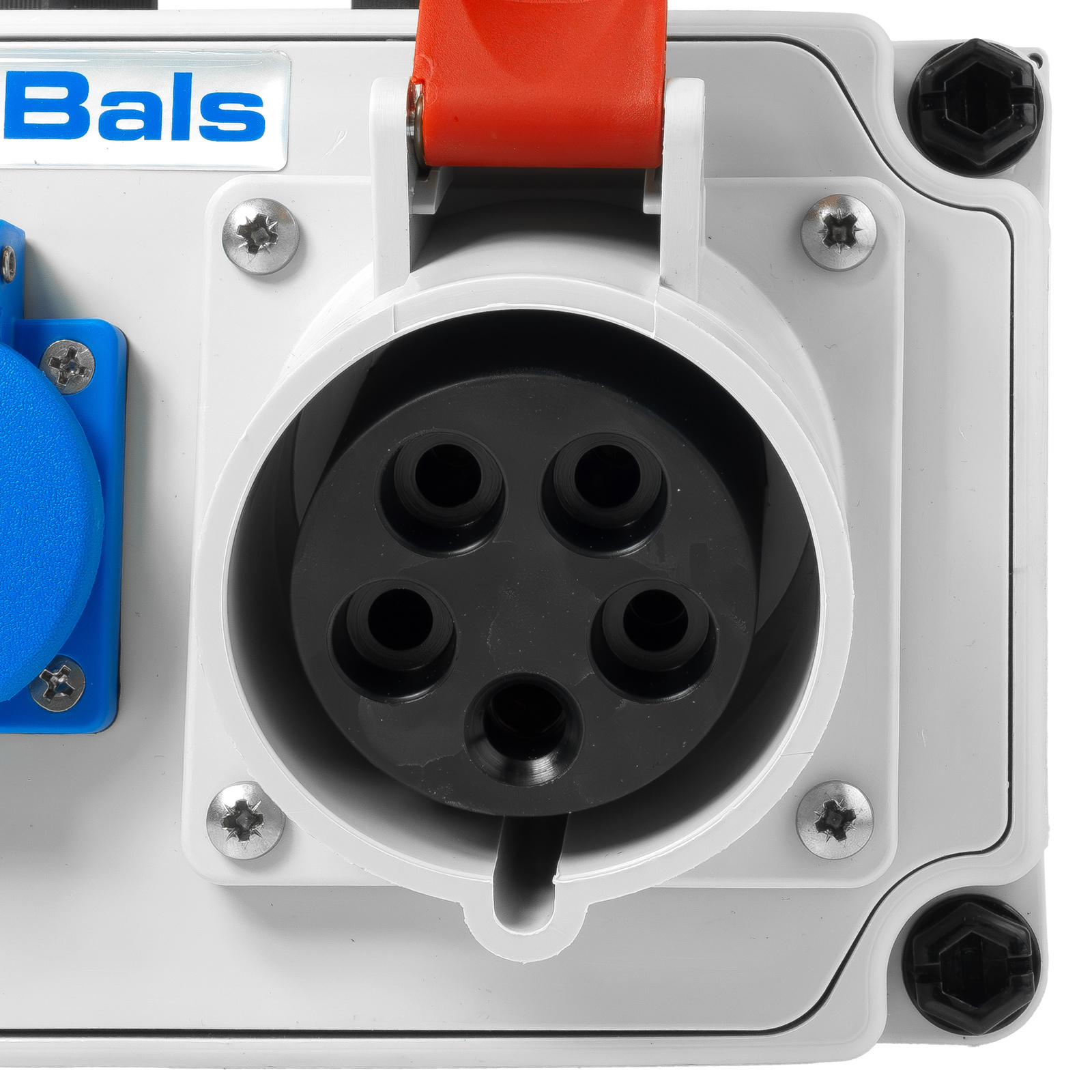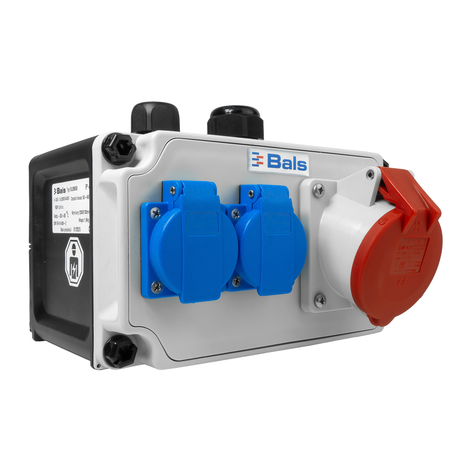 - Rozdzielnica elektryczna marki Bals wyposażona w 2x 230V 16A gniazda Bals oraz 1x 32A 400V, w pełni okablowana skrzynka budowlana o stopniu ochrony IP 44.