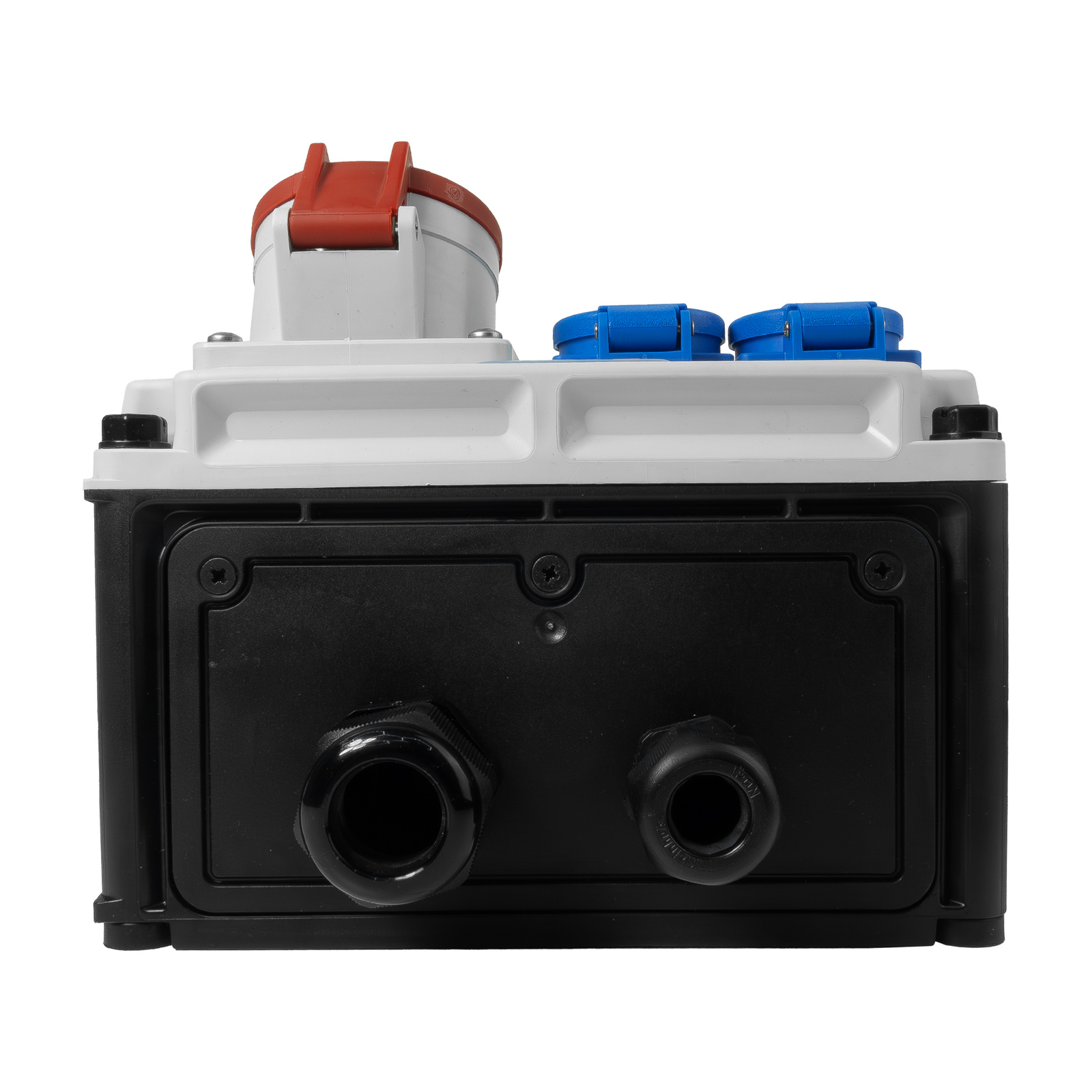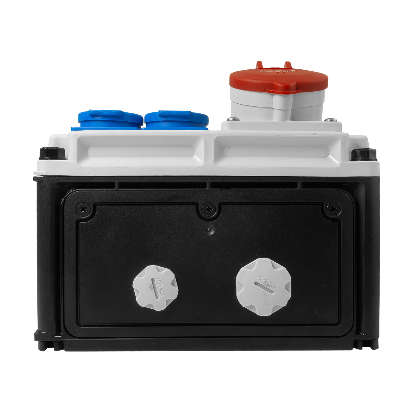 Wyposażenie: 2 x gniazdo jednofazowe 16A 230V IP54 niebieskie / 1 x Gniazdo CEE 32A 400V 5p 6h IP44 skośne