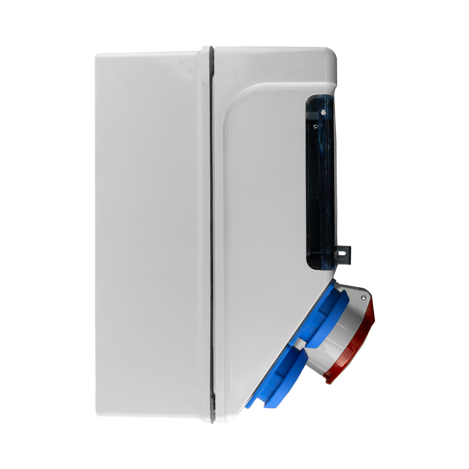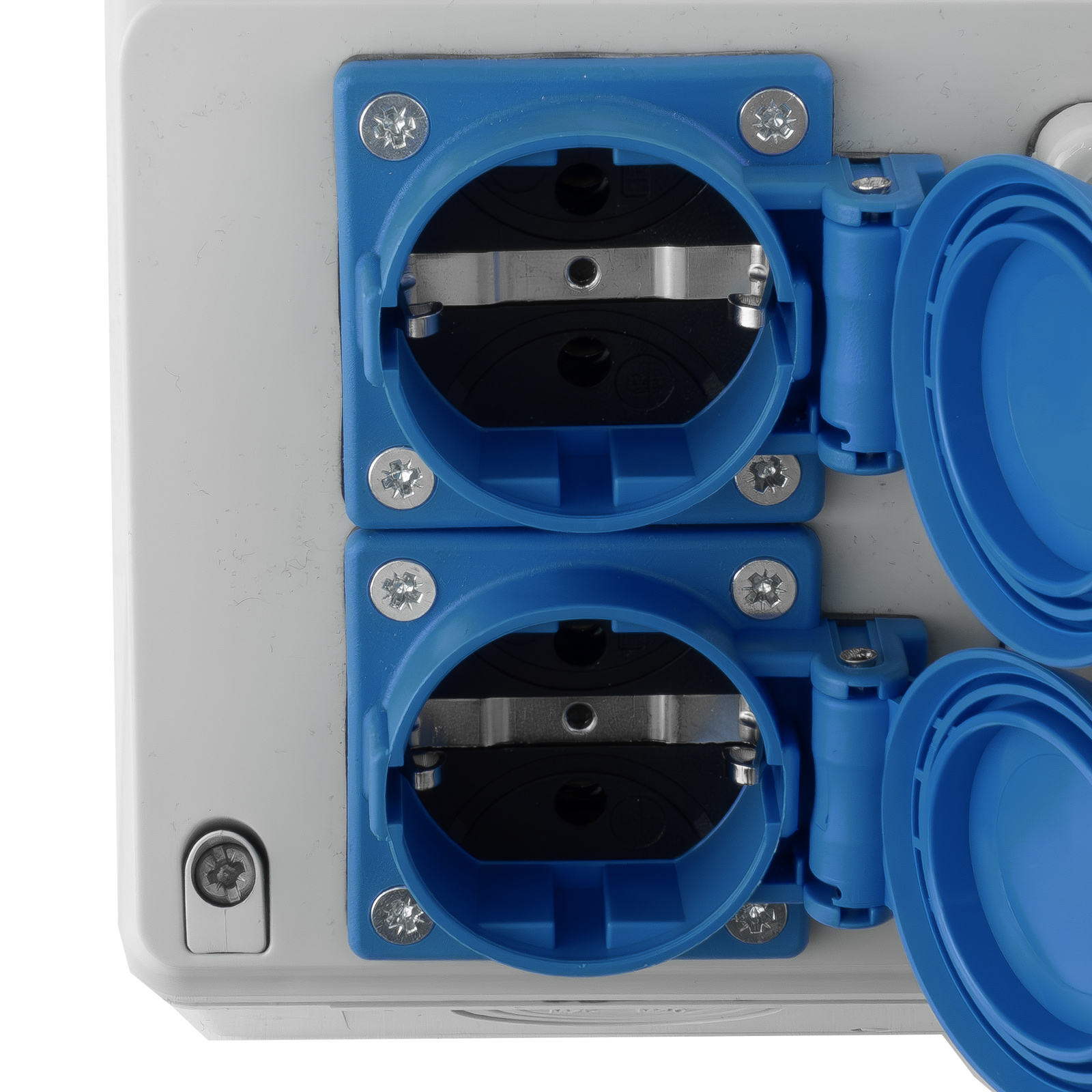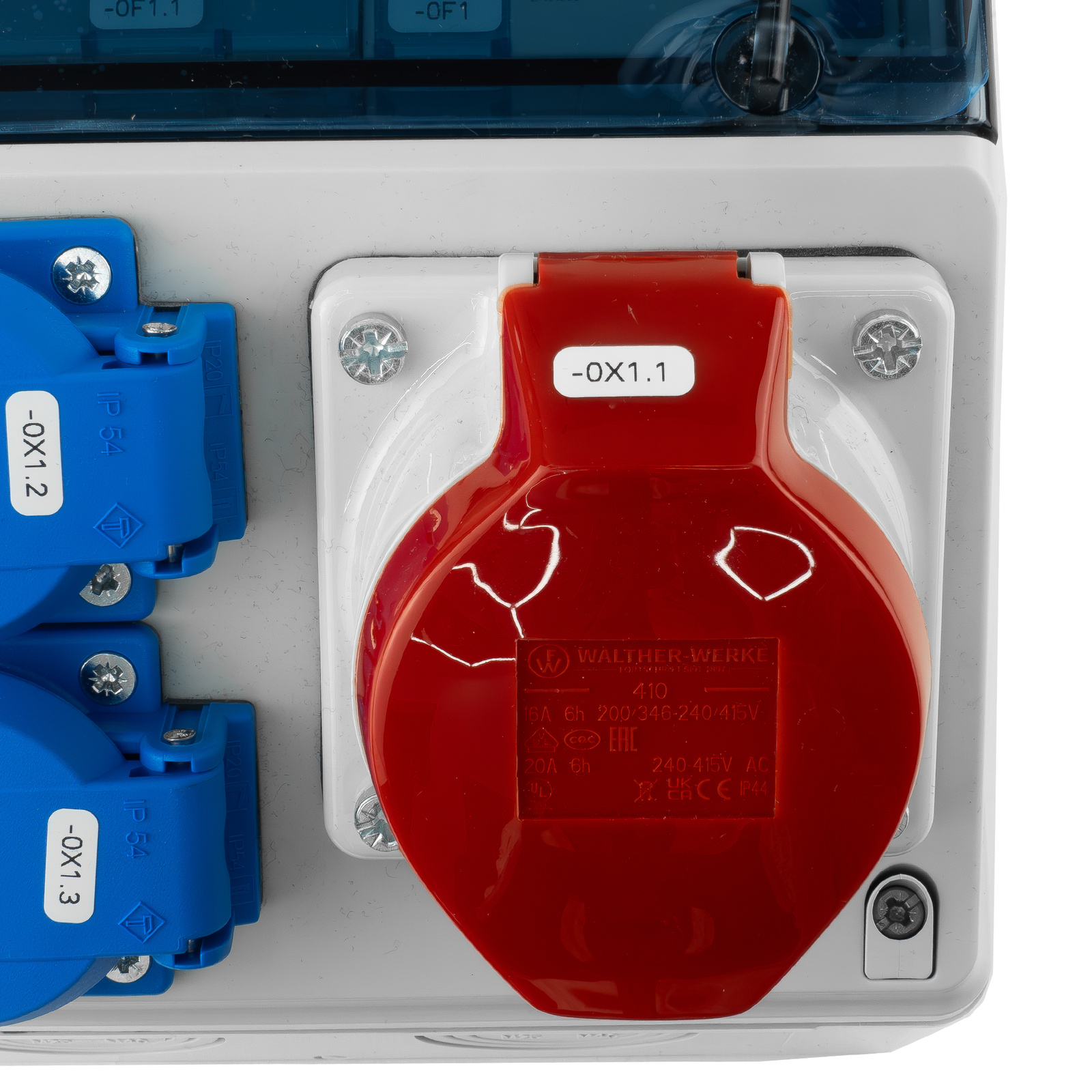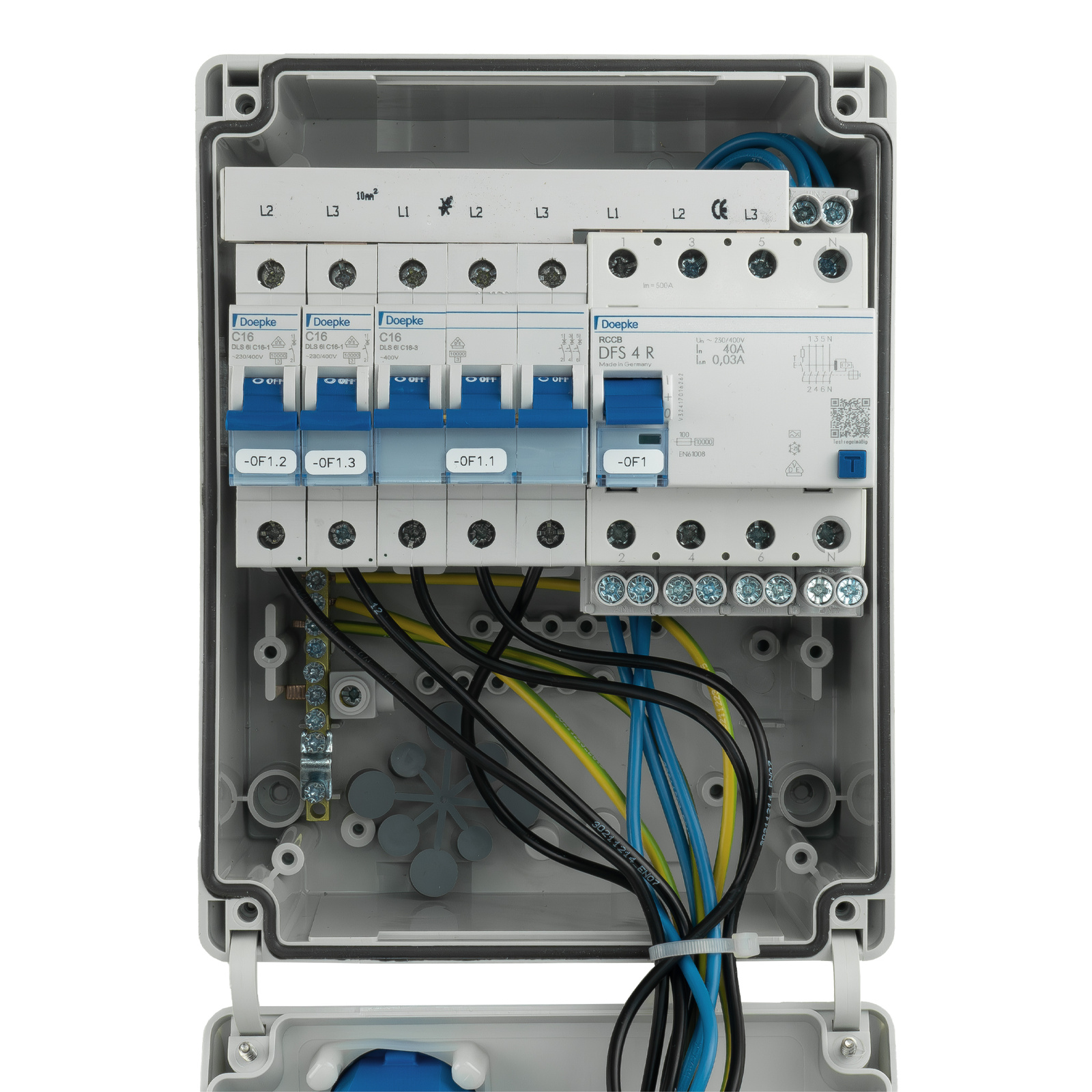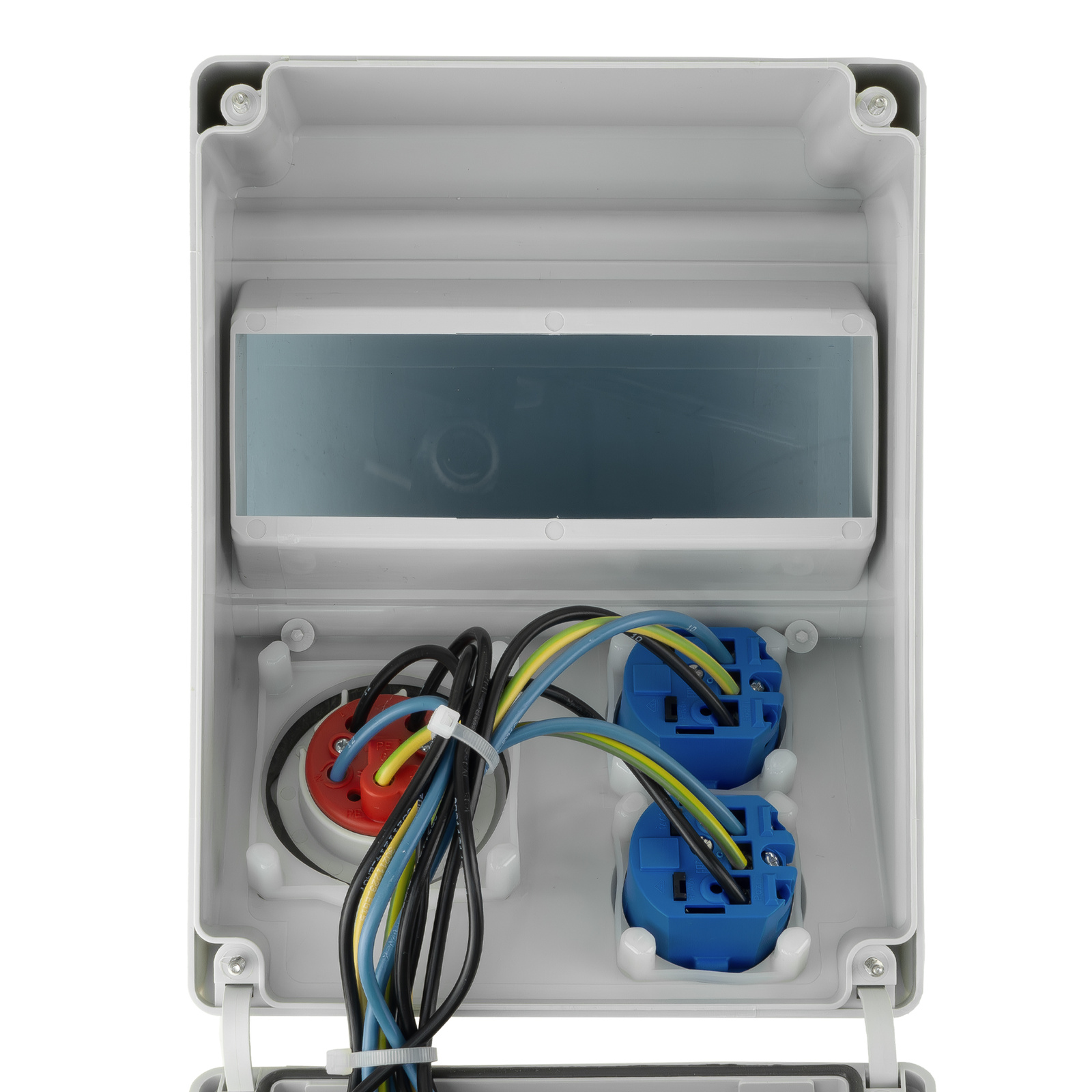 - Rozdzielnica budowlana oferuje gniazdo CEE 16A 5p 400V oraz dwa gniazda SCHUKO, przy czym każde złącze pracuje w oparciu o wyłącznik nadprądowy (MCB). Rozdzielnica elektryczna została wyposażona w wyłącznik różnicowoprądowy.
