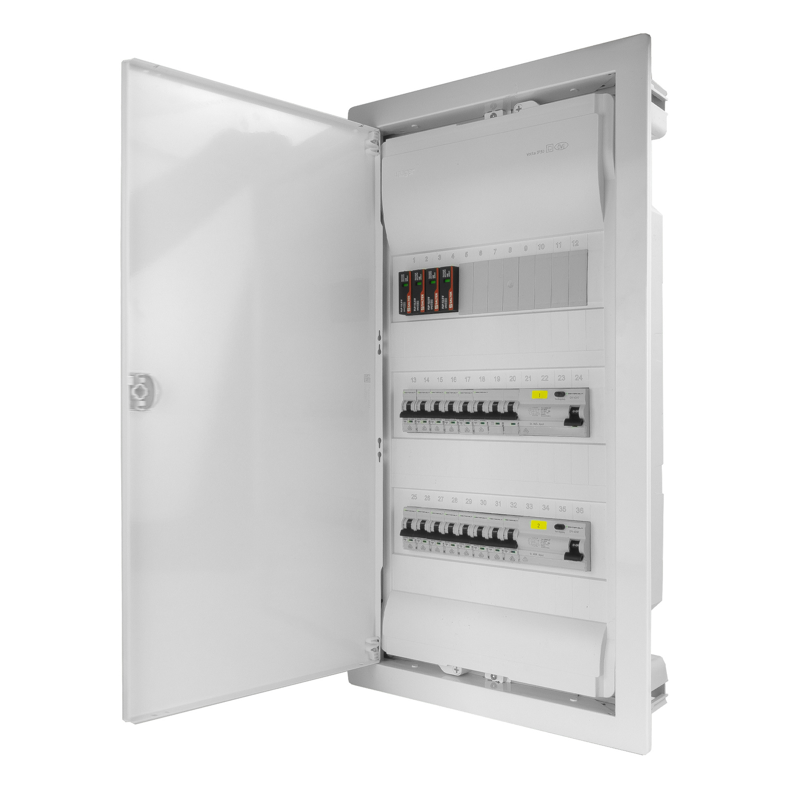 Rozdzielnica podtynkowa 630,50x348x98mm trzy rzędowa 36 modułowa z zabezpieczeniami 14xMCB 1xRCCB marki Doktorvolt ogranicznik przepięć Saltek