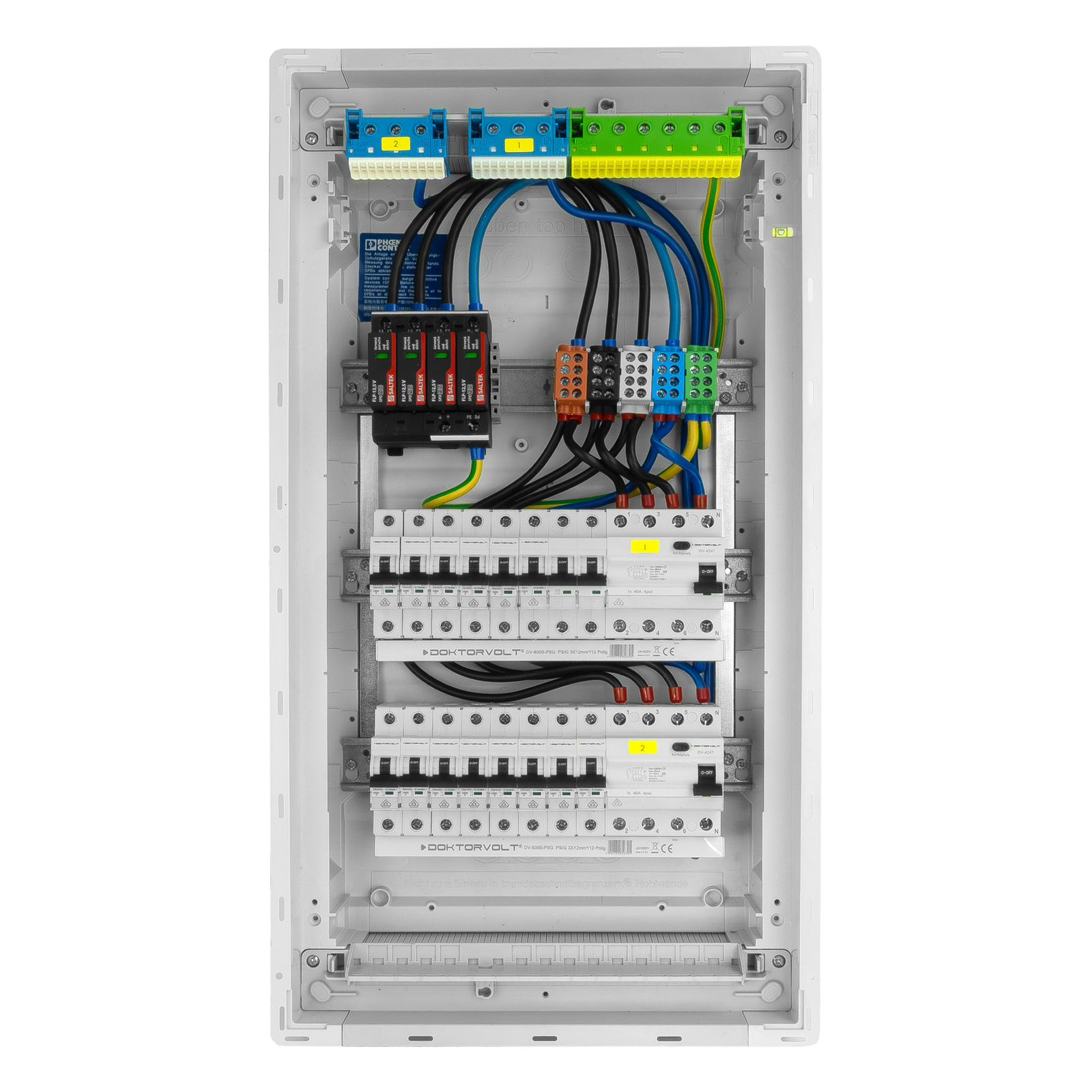 Rozdzielnica modułowa podtynkowa 3x12 zabezpieczona 14xMCB 1xRCCB VDE ogranicznik przepięć Saltek okablowana skrzynka elektryczna Hager 630,50x348x98mm zaciski rozgałęźne L1, L2, L3, N, PE Doktorvolt DV-6241-PT
