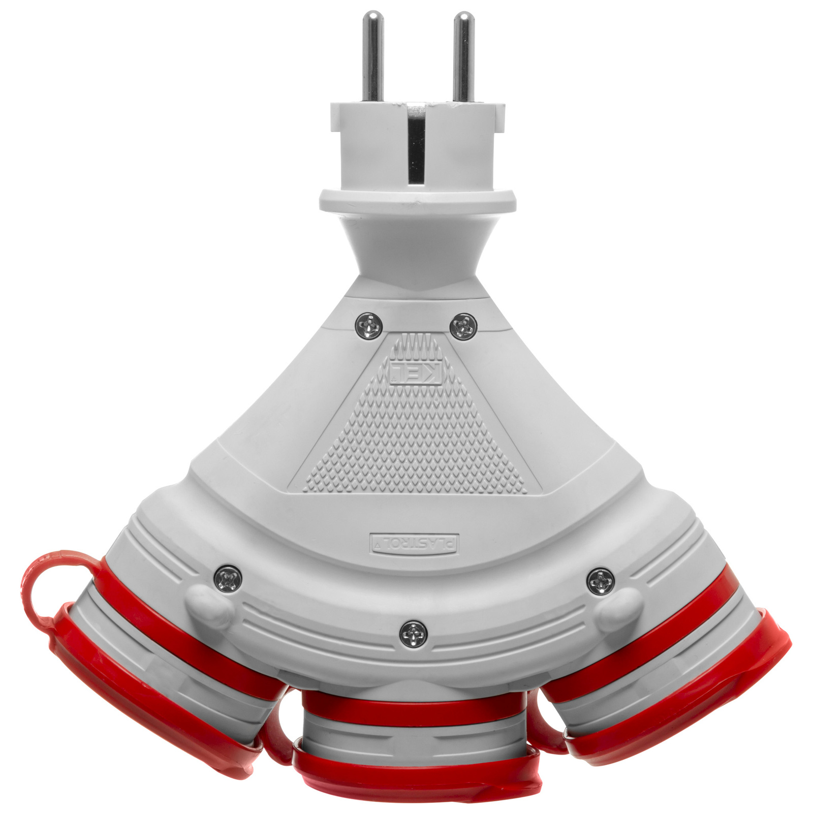 - Wytrzymały, szaro-czerwony rozbieralny rozgałęźnik z trzema hermetycznymi gniazdami 2P+Z 16A 250V Schuko i klapkami ochronnymi. Klasa szczelności IP44 – idealny do użytku w trudnych warunkach zewnętrznych i przemysłowych.