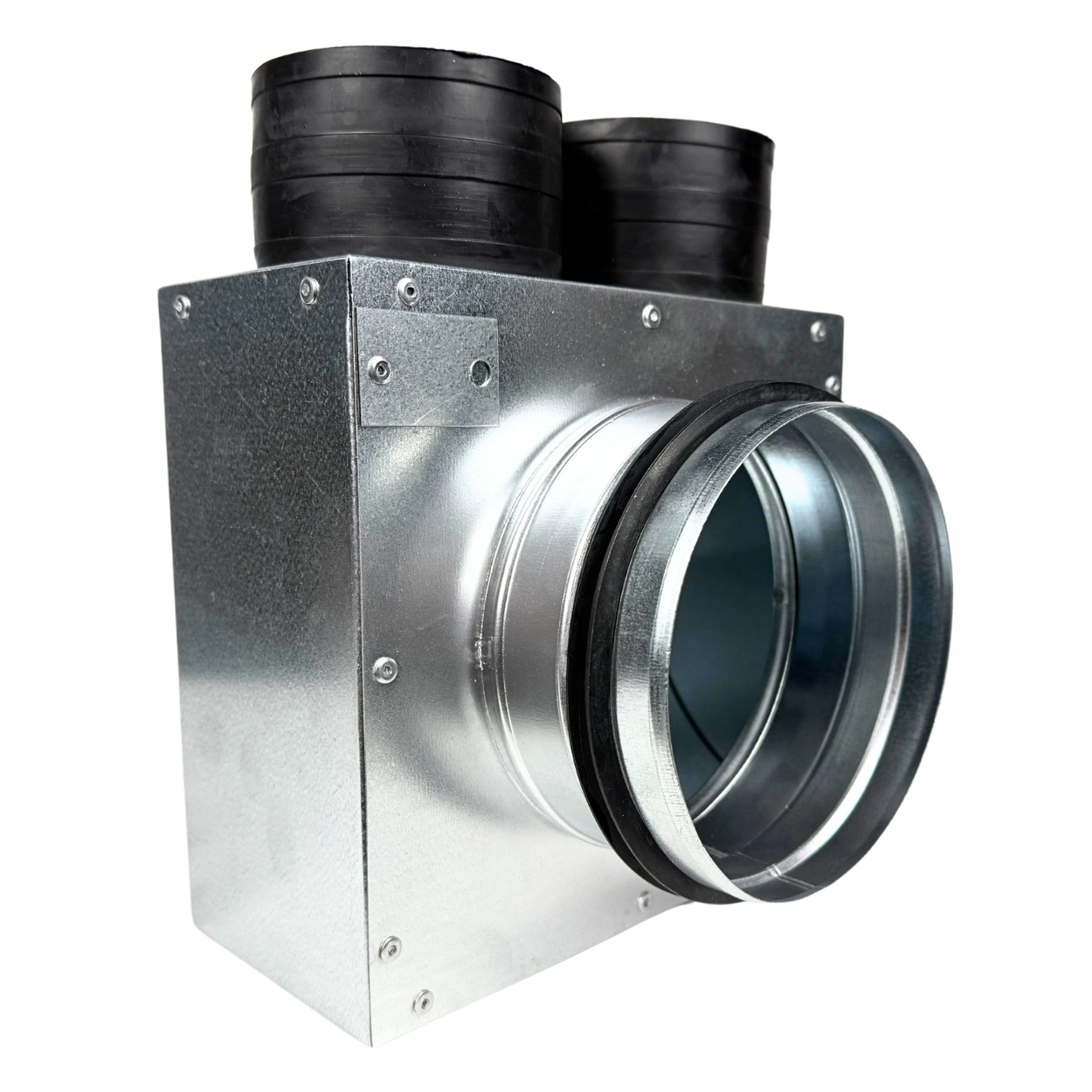 Kompaktowa skrzynka rozprężna z 2 króćcami Ø75 mm i przyłączem Ø125 mm. Wykonana z ocynkowanej blachy, wyposażona w gumowe króćce samouszczelniające. Umożliwia szybki montaż i wysoką szczelność bez dodatkowych uszczelek. Przeznaczona do nowoczesnych systemów wentylacyjnych nawiewno-wywiewnych.