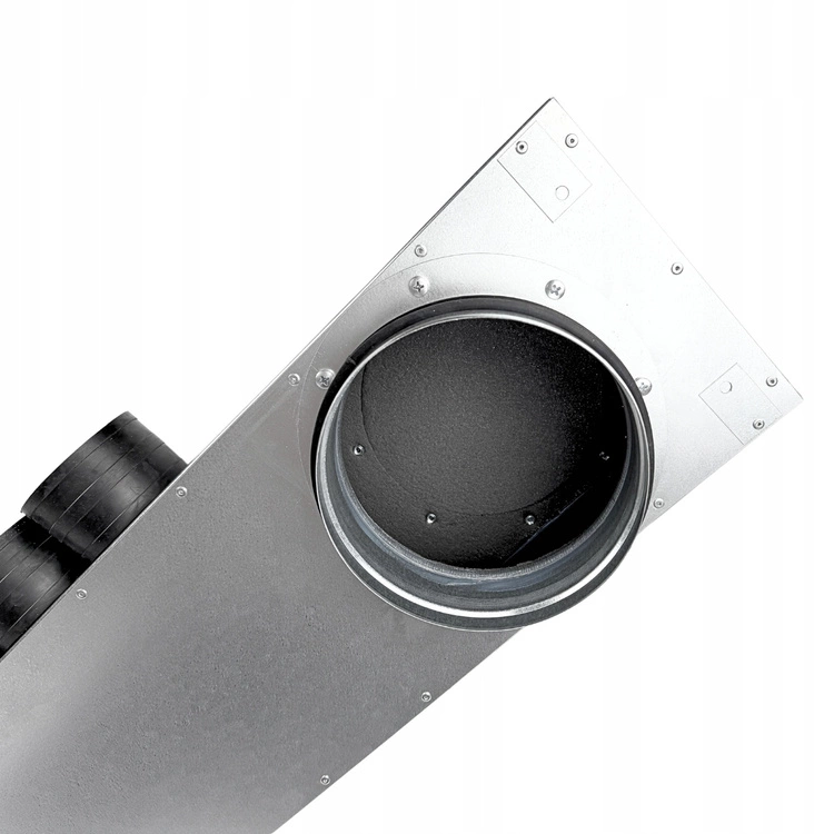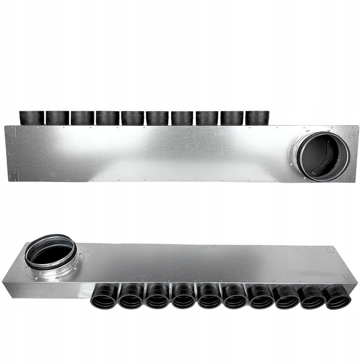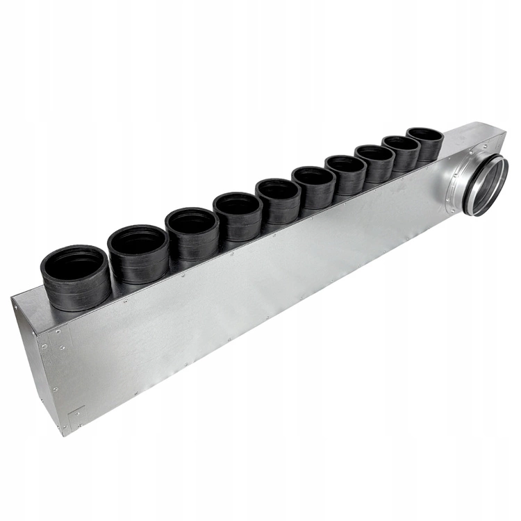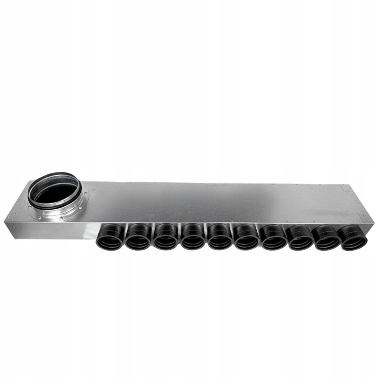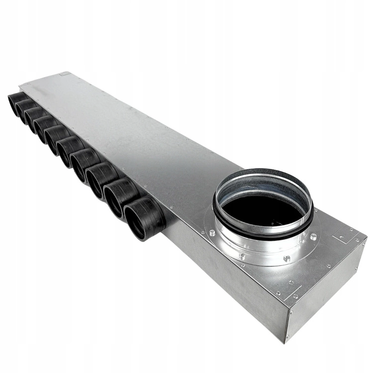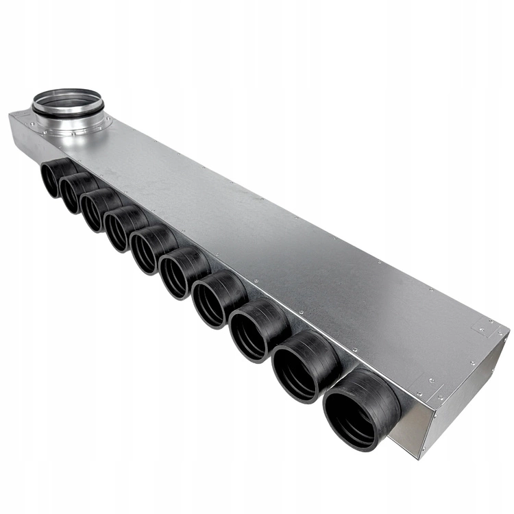 • Metalowy rozdzielacz wentylacyjny 10x75 mm, przyłącze 160 mm. Wyposażony w rewizję oraz przekładany króciec. Wytłumiony matą antybakteryjną, samouszczelniający się system połączeń bez uszczelek. Kompatybilny z rurami karbowanymi Ø75.