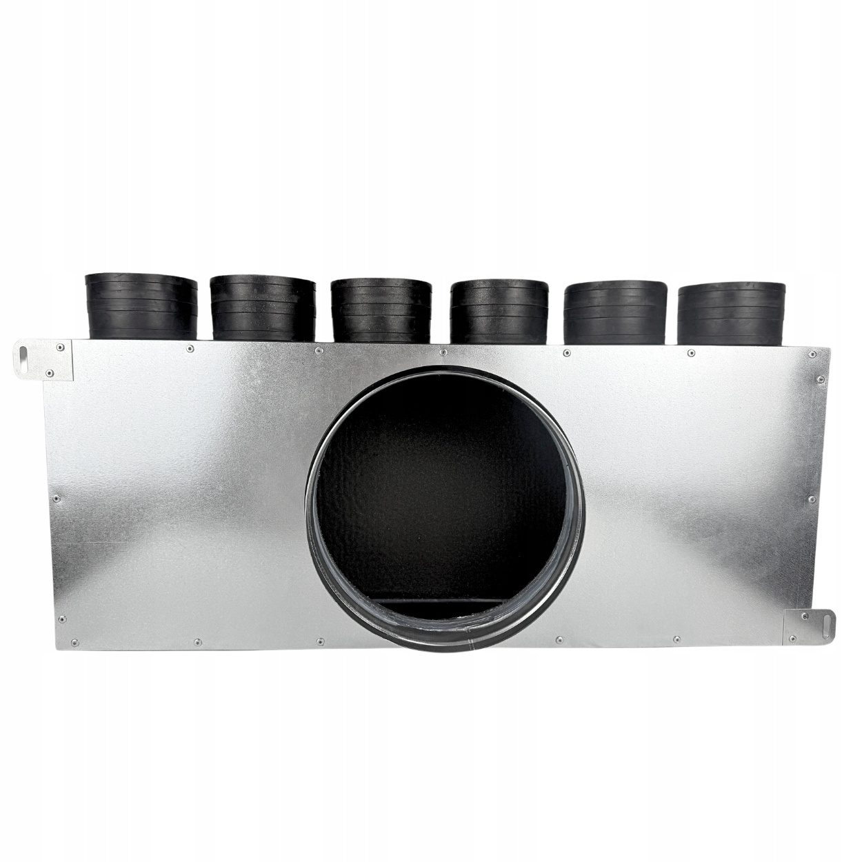 Rozdzielacz wyposażony w gumowe króćce samouszczelniające, zapewniające szczelność bez dodatkowych uszczelek. Wytłumiony i uszczelniony antybakteryjną matą wentylacyjną. Modułowa konstrukcja zapewnia łatwość montażu. Kompatybilny ze wszystkimi rurami karbowanymi Ø75 dostępnymi na rynku. Otwór rewizyjny - przekładany krócieć fi 160.