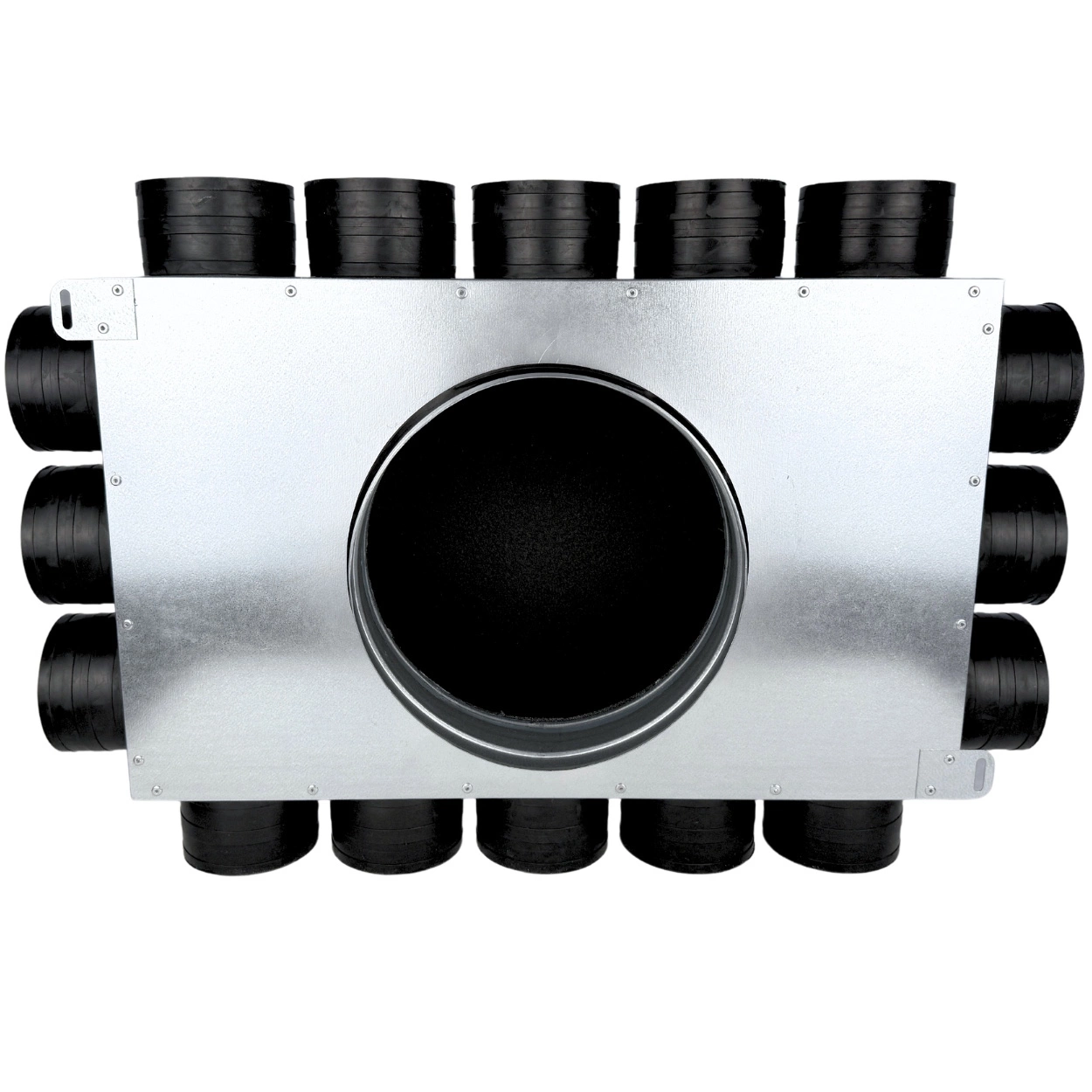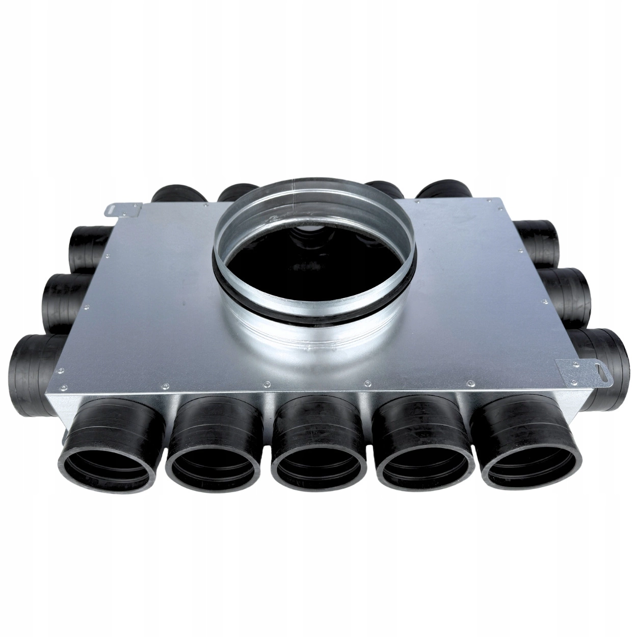 - Rozdzielacz przelotowy z 16 króćcami Ø75 mm i przyłączem Ø200 mm. Tłumiony, uszczelniony matą antybakteryjną, bezuszczelkowy. Stal ocynkowana odporna na korozję. Idealny do systemów nawiewno-wywiewnych i rekuperacji.