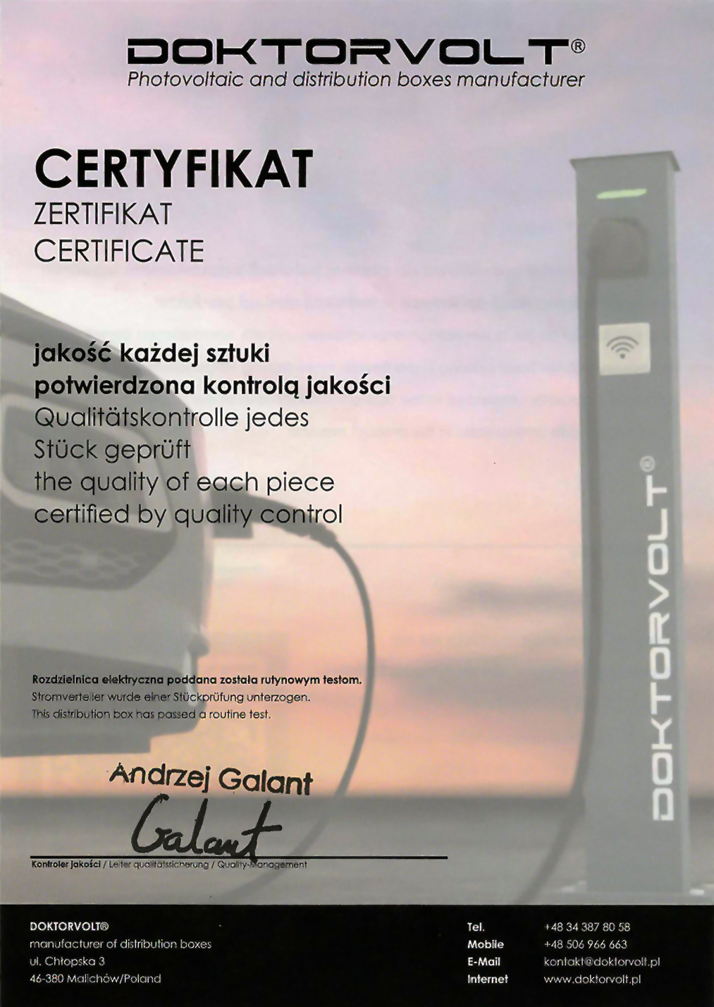 Doktorvolt® to firma założona w 2013 roku. Dynamicznie rozwijająca się firma podbiła rynek polski i zagraniczny. Siedziba firmy znajduje się w Malichowie w województwie opolskim, gdzie mieści się również nowoczesna hala produkcyjna i magazyn. Firma specjalizuje się w produkcji rozdzielnic budowlanych i wyróżnia się jakością oraz solidnym wykonaniem. Każda rozdzielnica składa się z wysokiej jakości komponentów. Produkty firmy Doktorvolt® spełniają europejskie normy i standardy bezpieczeństwa.