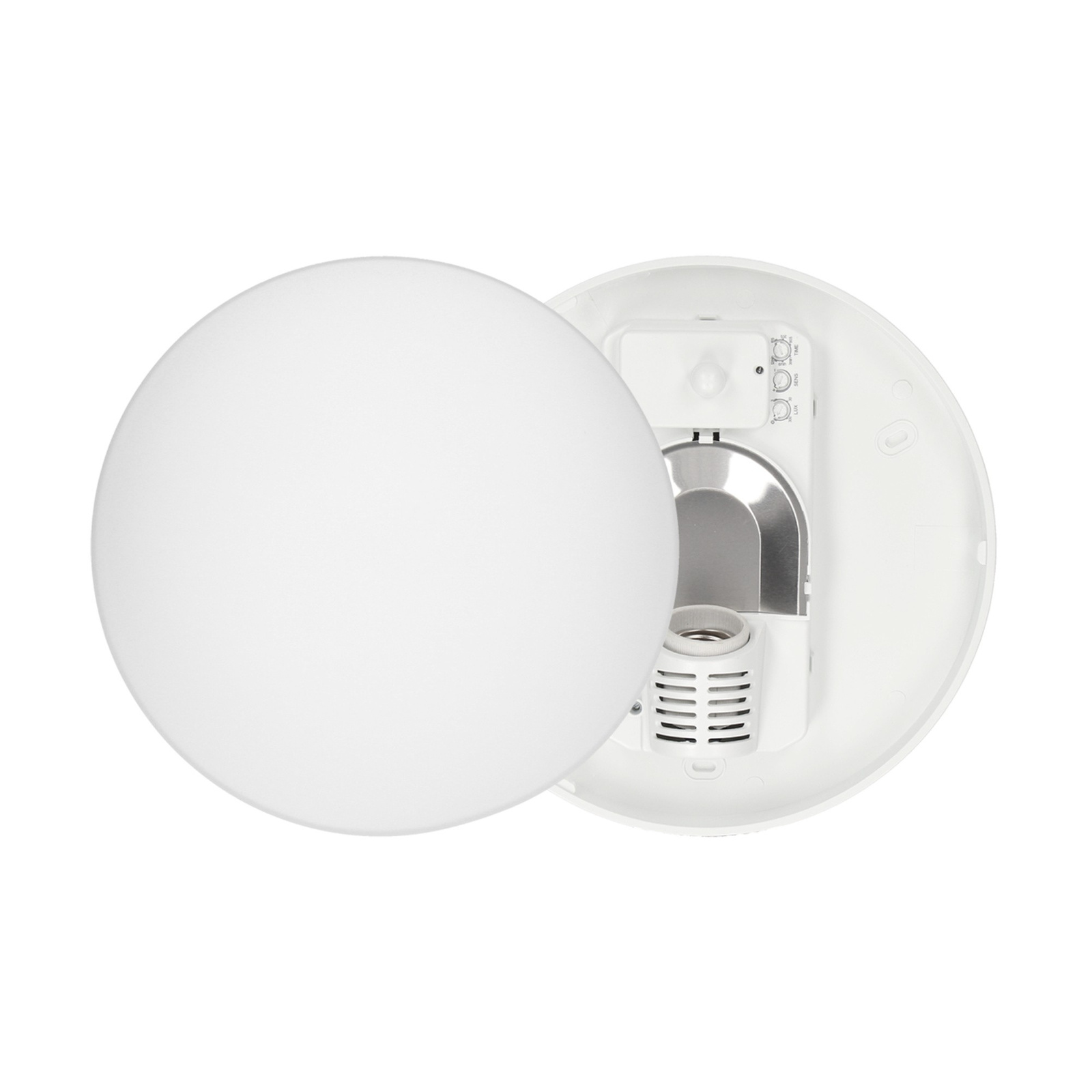 Plafon przeznaczony do automatycznego oświetlania pomieszczeń takich jak klatki schodowe, korytarze, piwnice, garaże, magazyny itp. Wyposażony jest w mikrofalowy czujnik ruchu, który umieszczony jest wewnątrz i w zależności od ustawień wykryje nawet najmniejszy ruch. Dzięki trzem potencjometrom czujnik może być ustawiony odpowiednio do potrzeb, tak aby działać dokładnie w momencie przebywania i ruchu osób na danym obszarze. Regulacja: czasu świecenia, czułości natężenia światła i zasięgu wykrywania ruchu. Materiał: podstawa poliwęglan (PC), klosz szklany, mleczny.