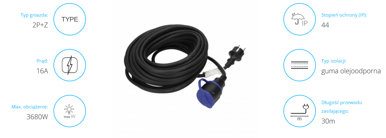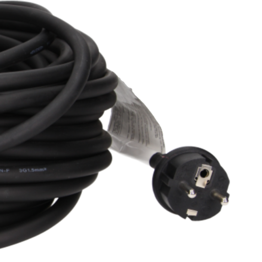 ➡️ Posiada przesłony torów prądowych. Gumowy, olejoodporny kabel z uziemieniem (H07RN-F 3x1,5mm2) ma długość 30m.
