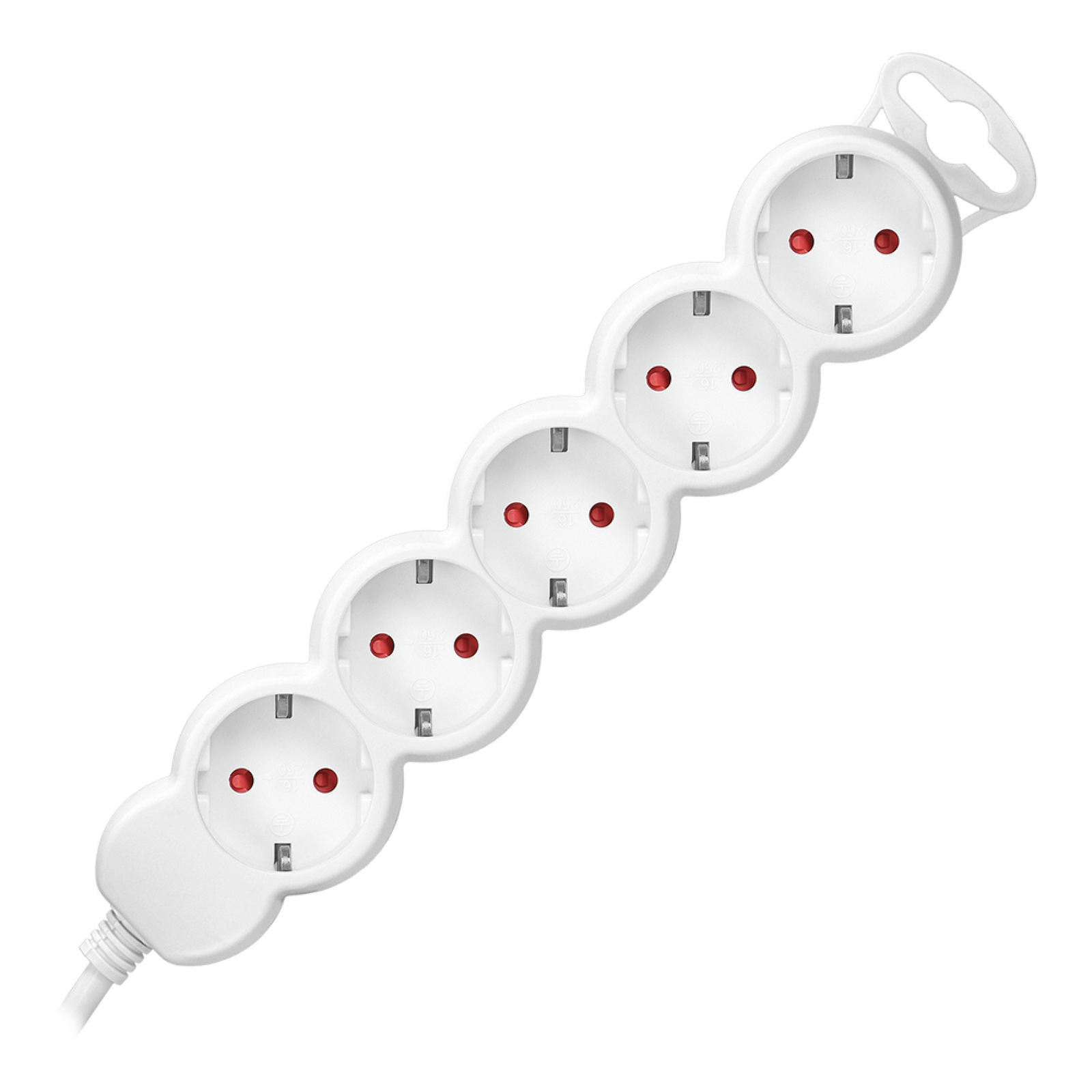- Biały przedłużacz z 5 gniazdami, 2P+Z (schuko) i kablem o długości 1,5m. Służy do podłączenia kilku urządzeń do jednego źródła prądu.