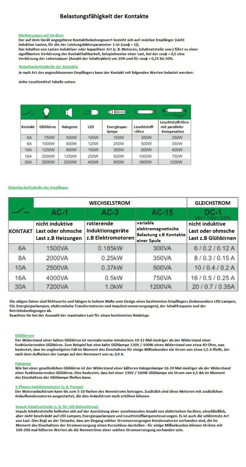 Powyższe dane mają charakter orientacyjny i w dużym stopniu zależeć będą od konstrukcji konkretnego odbiornika (szczególnie dotyczy to lamp LED, lamp energooszczędnych ESL, transformatorów elektronicznych i zasilaczy impulsowych), częstotliwości załączeń oraz warunków pracy. Dobierając maksymalne obciążenie dla danego typu przekaźnika należy uwzględnić: