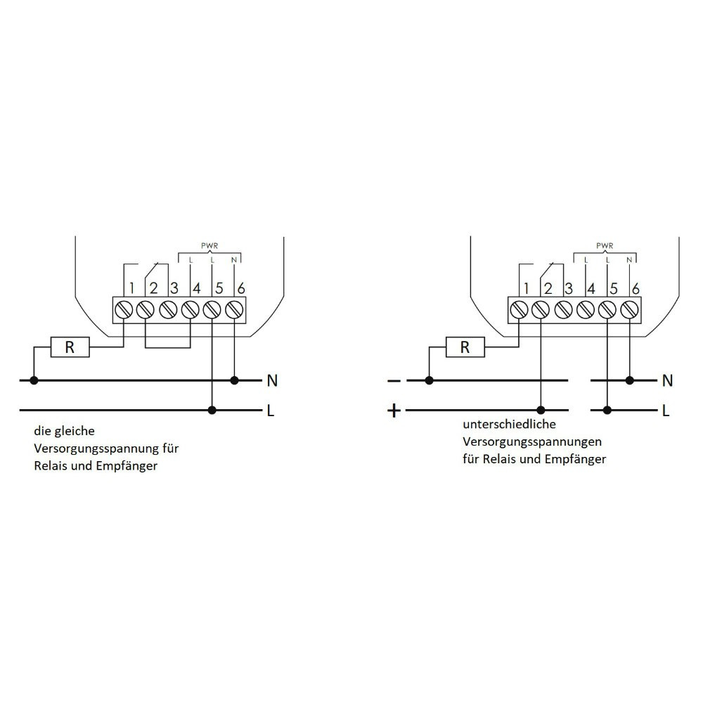 4) Obwód zasilania sterowanego odbiornika podłączyć przez styki 1-2 (styki zwierne) Uwaga! W przypadku tego samego źródła zasilania dla przekaźnika i sterowanego odbiornika można wykonać "mostek" pomiędzy punktem 4/5 i wejściem 2.