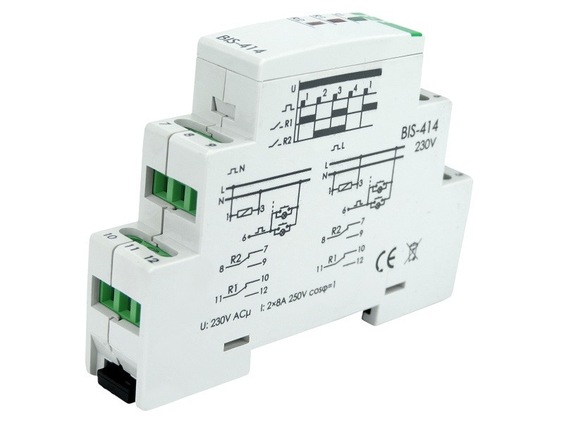 - BIS-414 230V 2x8A Przekaźnik bistabilny impulsowy sekwencyjny świecznikowy na szynę F&F