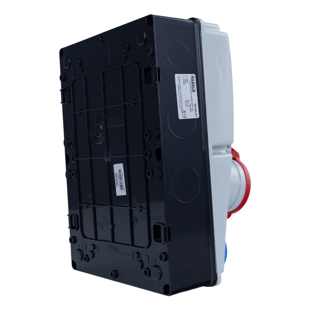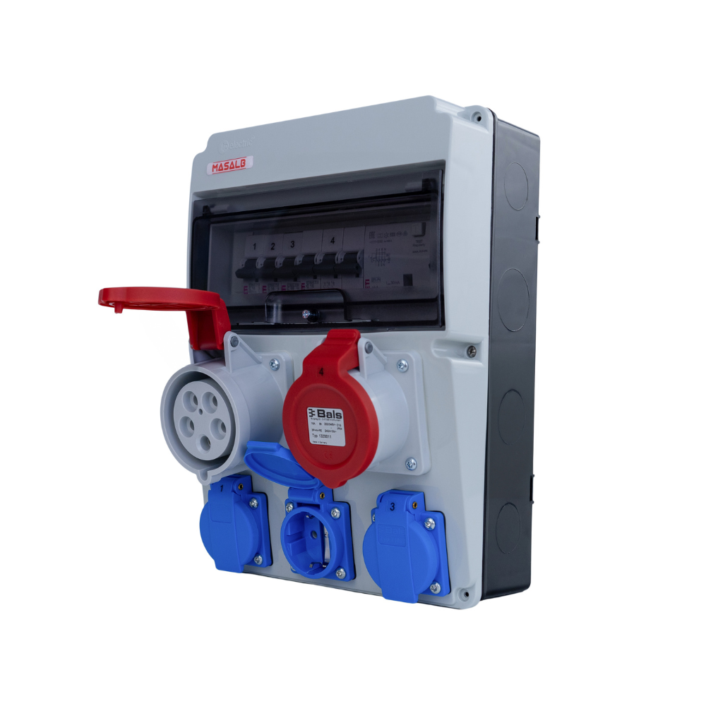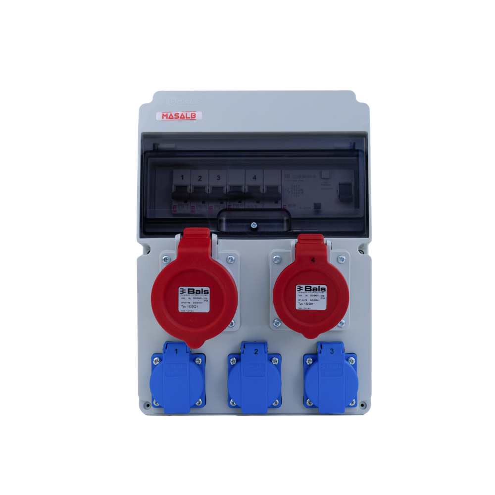 Kompaktowa i solidna obudowa wykonana z wysokiej jakości materiałów, wyposażona w 3x gniazda 230V 16A oraz 2x gniazda siłowe 1x 32A 400V i 1x 16A 400V firmy Masalb.