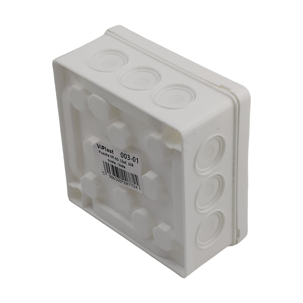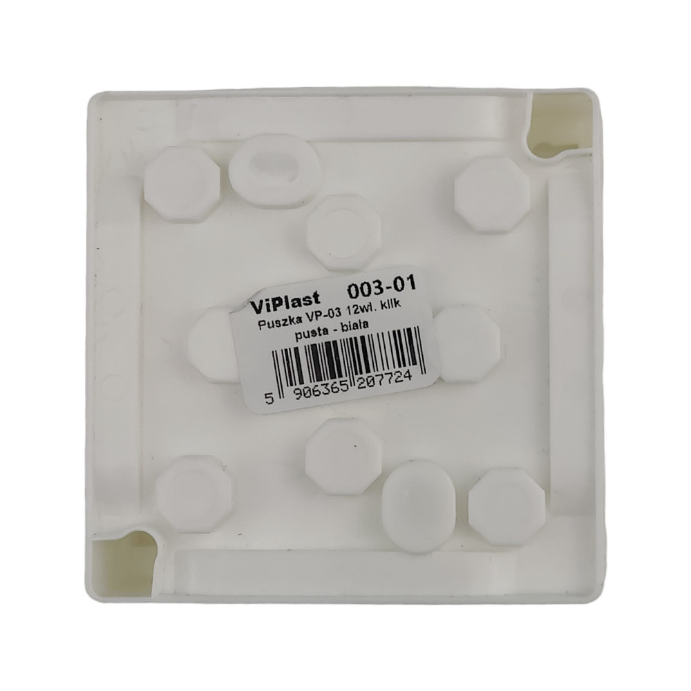 Puszka elektryczna instalacyjna pusta o wymiarach 86x86x40mm z klasą szczelności IP55. Biała puszka elektryczna 003-01 ViPlast, do montażu natynkowego. Hermetyczna puszka, ze stopniem ochrony IP55, posiada 12 wejść na przewody elektryczne o maksymalnym przekroju 4mm2.