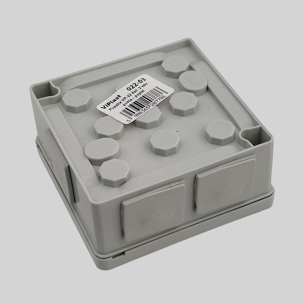 Puszka elektryczna instalacyjna pusta o wymiarach 86x86x40mm z klasą szczelności IP55. Popielowa puszka elektryczna 022-03 ViPlast, do montażu natynkowego. Hermetyczna puszka, ze stopniem ochrony IP55, posiada 6 wejść na przewody elektryczne.
