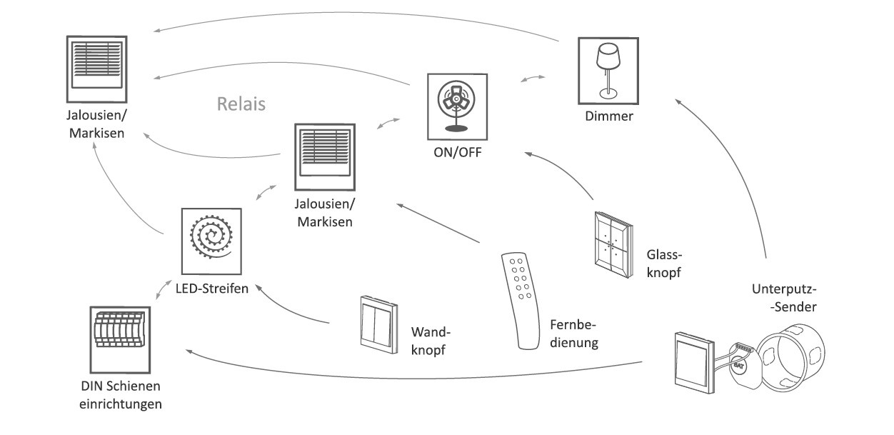 oraz w puszce podtynkowej Ø60. Nadajniki występują jako podręczne piloty, przyciski