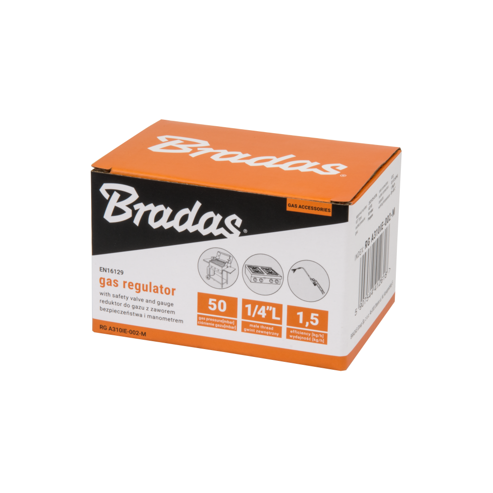 Reduktor gazowy 50mbar, 1,5kg/h, z zaworem bezpieczeństwa i manometrem, GZ 1/4" L