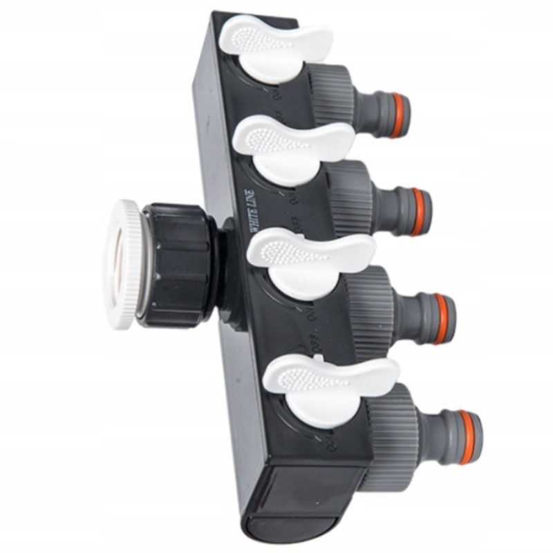 Rozdzielacz z czterema niezależnymi regulowanymi zaworami na kran 1" z redukcją na przyłącze 3/4" z nyplami do szybkozłączek. Jest wykonany z bardzo dobrej jakości tworzywa PVC. Do profesjonalnego użytku w systemach nawadniających i zraszających.