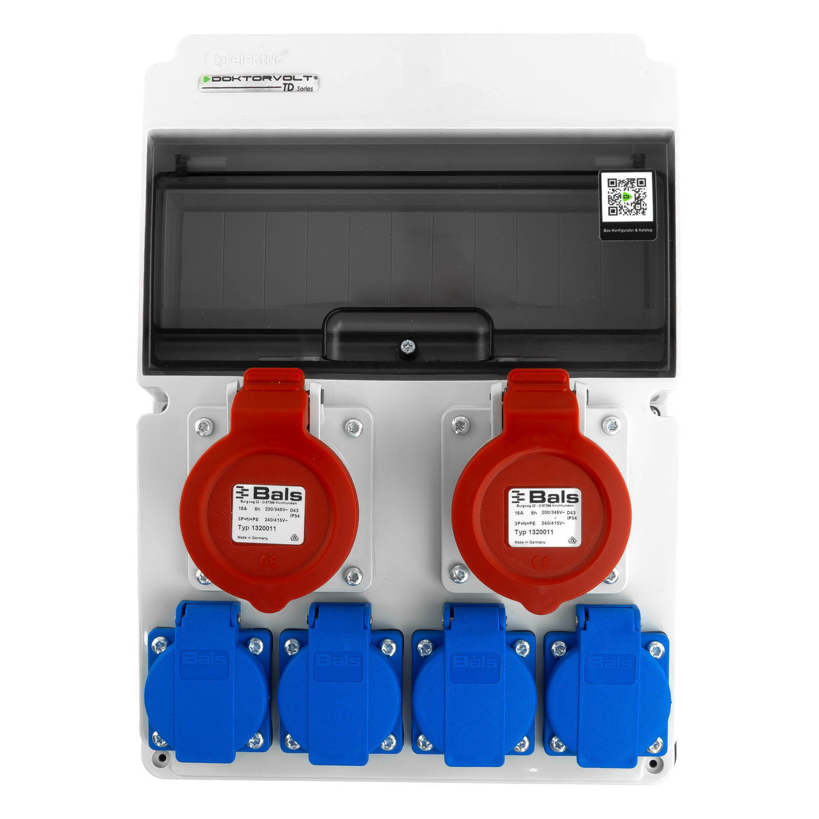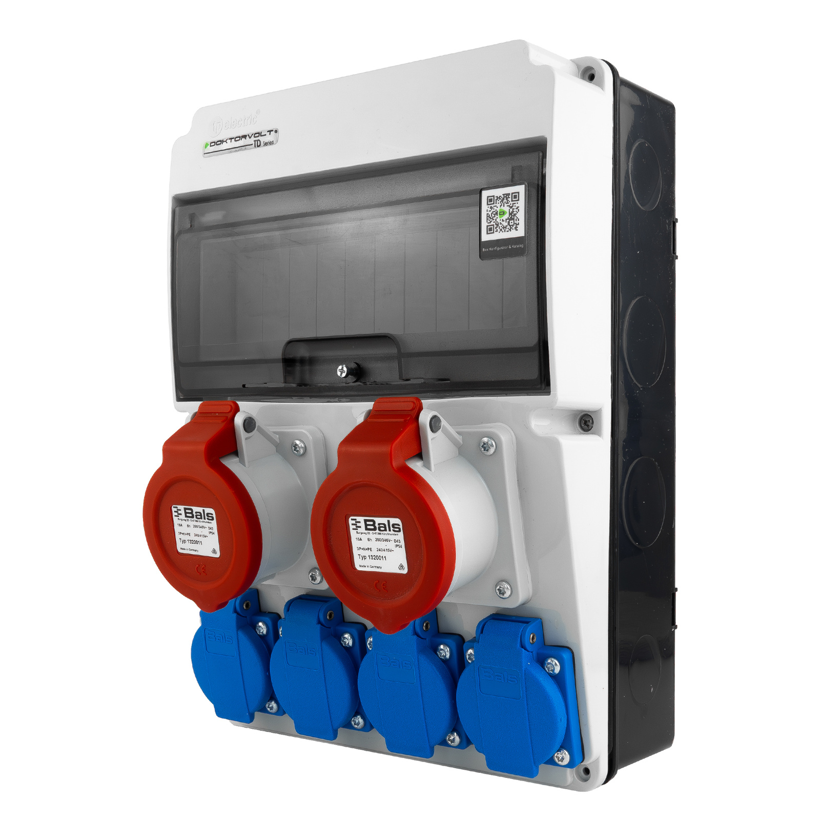 Gotowa do użycia rozdzielnica budowlana JUN 2x16A 4x230V marki Doktorvolt® z gniazdami Bals. Odporna na warunki zewnętrzne (IP44), idealna na budowę, do warsztatu i zastosowań mobilnych