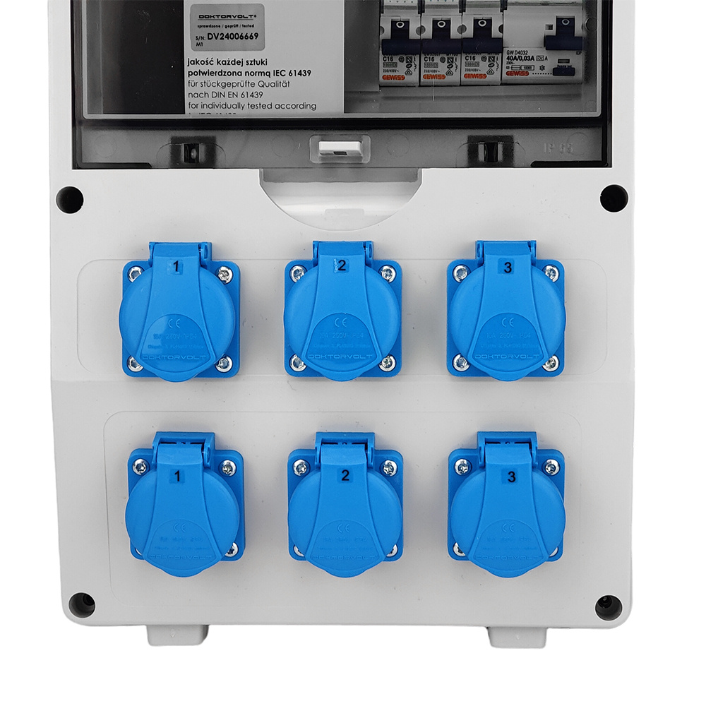 ✔️ sześć gniazd 6x 230V 16A o klasie szczelności IP 54,