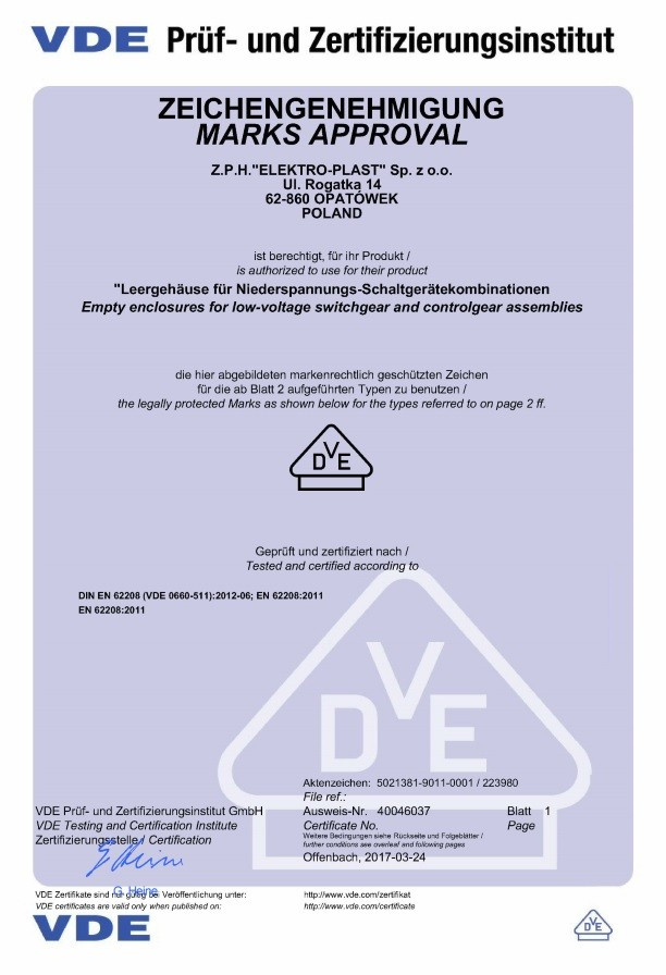 Produkt wysokiej jakości, wykonany z najwyższej klasy materiałów. Przystosowany do użytku wewnątrz pomieszczeń. Wyroby firmy Elektro-Plast Sp. z o.o. zostały docenione nadaniem certyfikatu TÜV Rheinland.