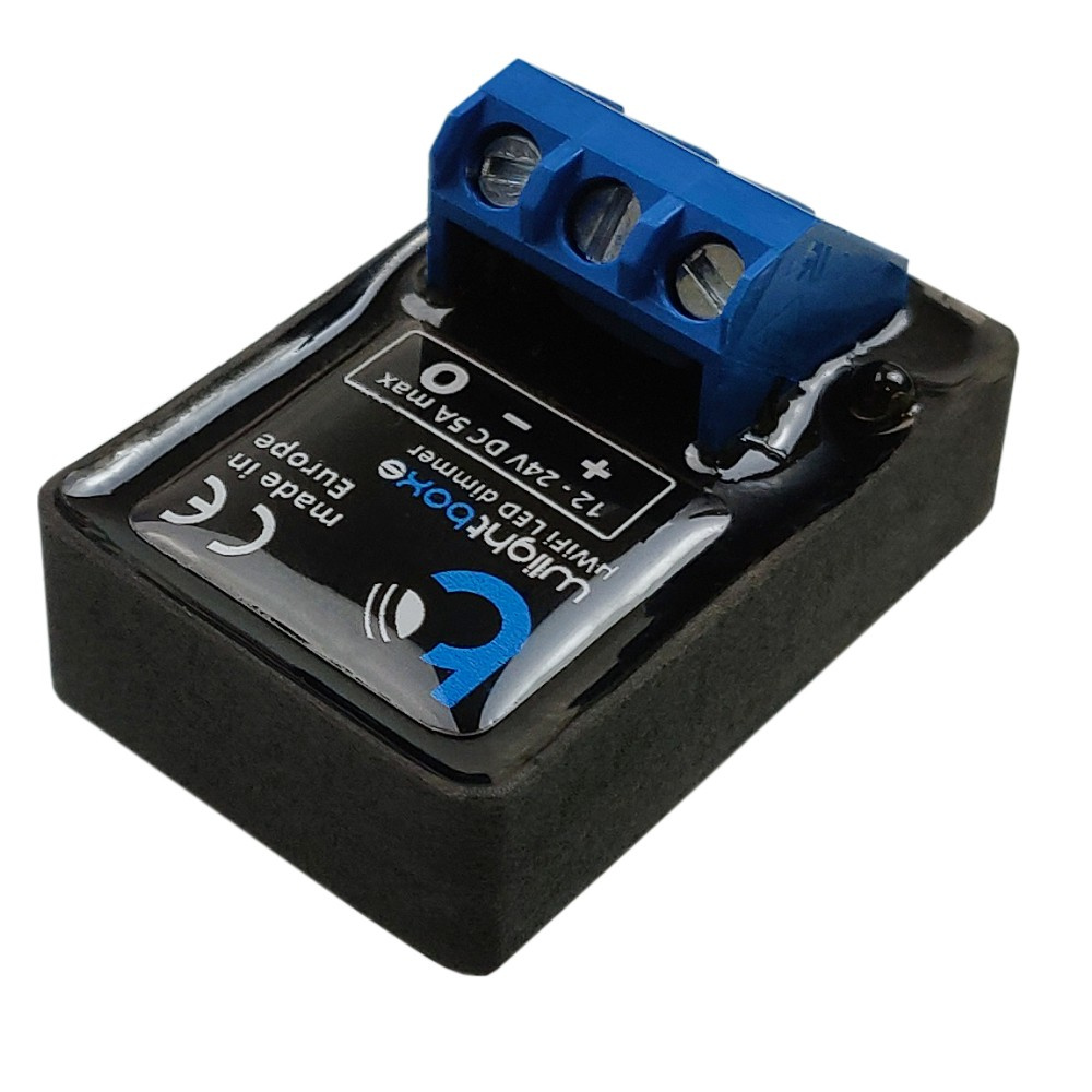 BleBox wLightBoxS to moduł umożliwiający sterowanie jednokolorowymi taśmami LED za pomocą aplikacji na smartfona z dowolnego miejsca na świecie poprzez sieć WiFi. Sterownik wLightBoxS zasilany jest napięciem od 12V do 24V.