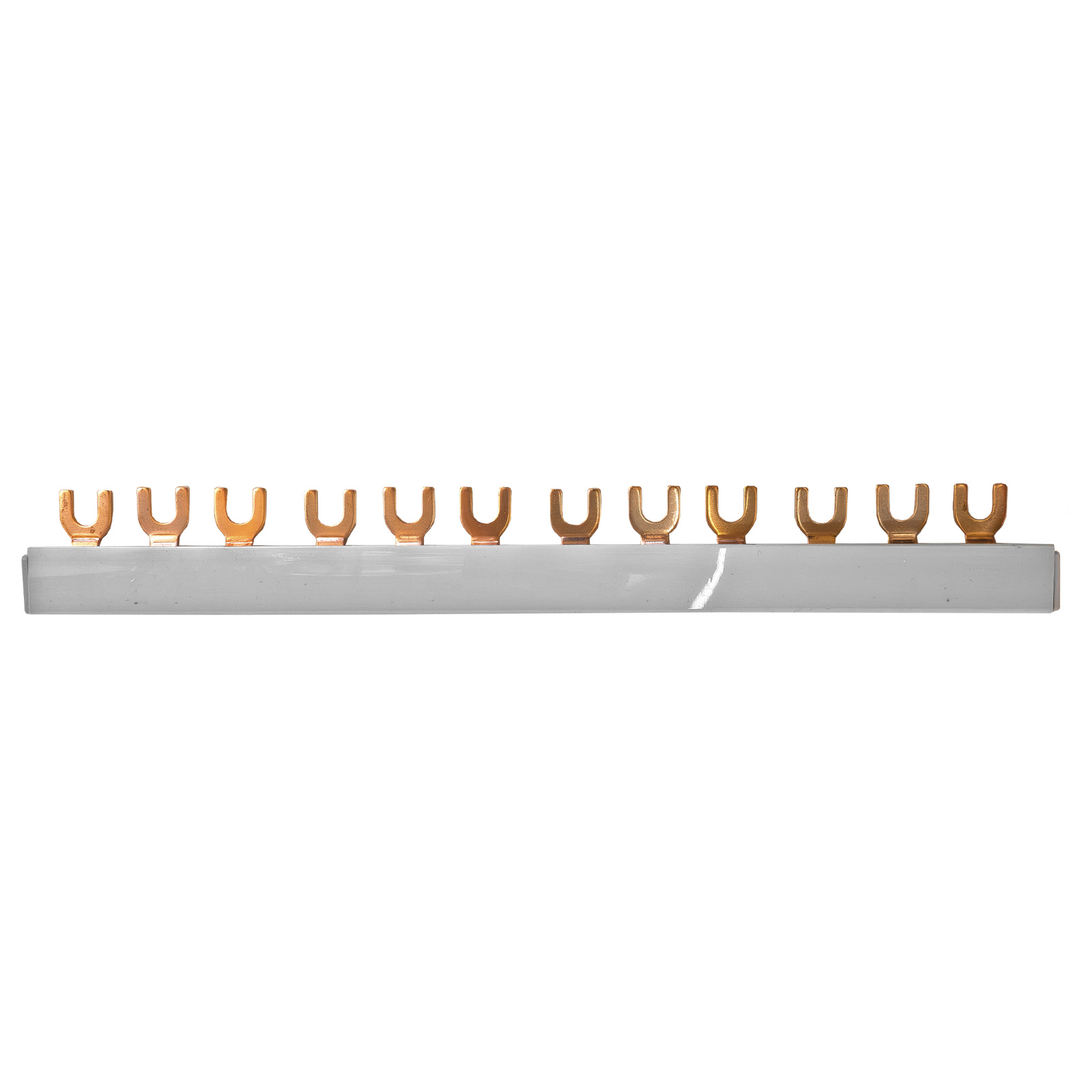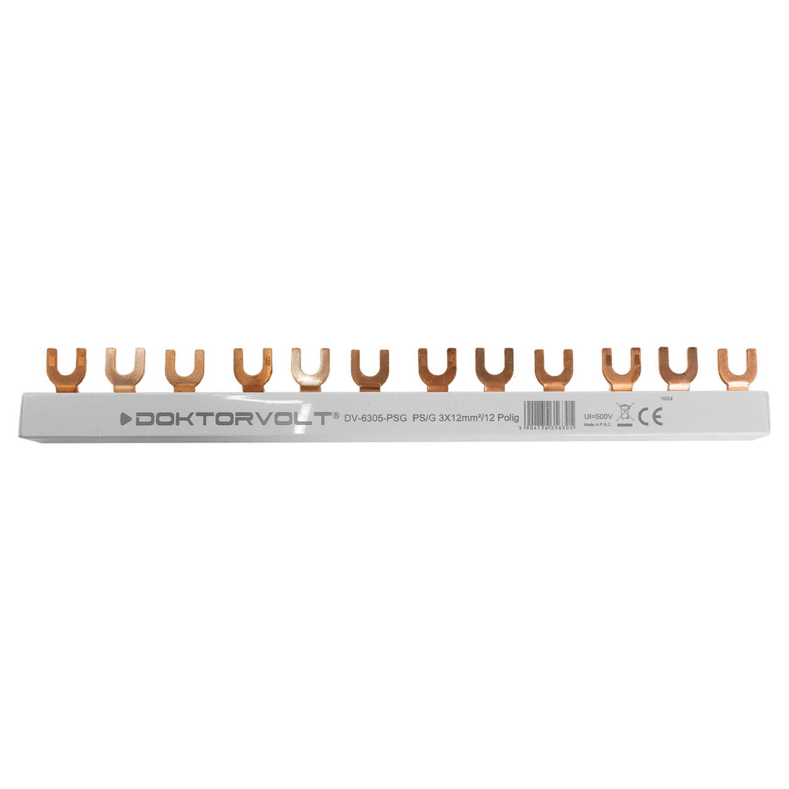 Szyna fazowa 3P z końcówką widełkową, 12-polowa, o przekroju 12 mm², przeznaczona do rozdziału zasilania w instalacjach 3-fazowych. Obsługuje do 12 modułów, maksymalny prąd znamionowy to 80A. Produkt marki Doktorvolt.