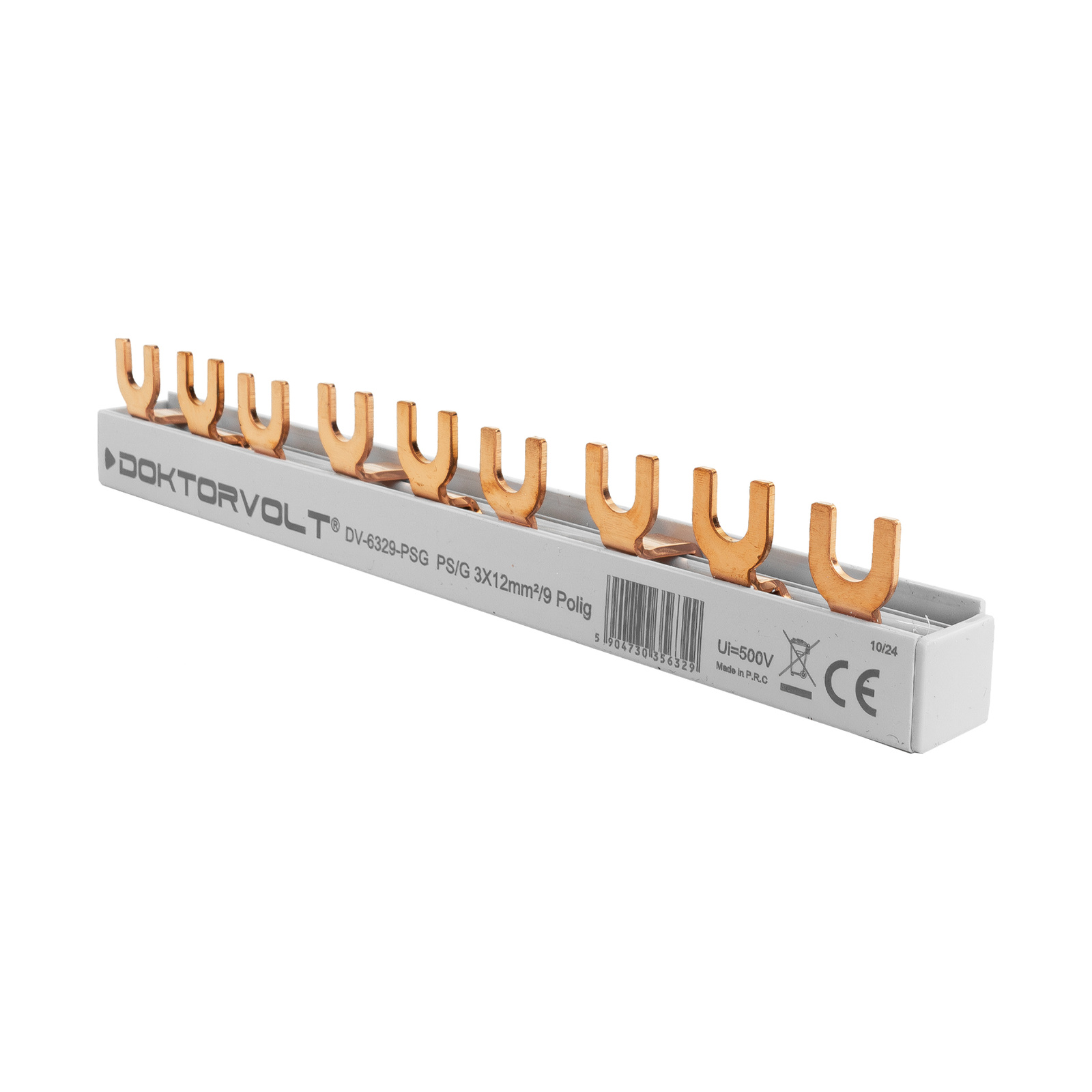 - Trójfazowa szyna grzebieniowa 3P marki Doktorvolt z końcówką widełkową zapewnia równomierny rozdział mocy do 80A. Przeznaczona do 9 urządzeń, długość 16,5 cm, przekrój 12 mm² – idealna do zastosowań przemysłowych i budowlanych.