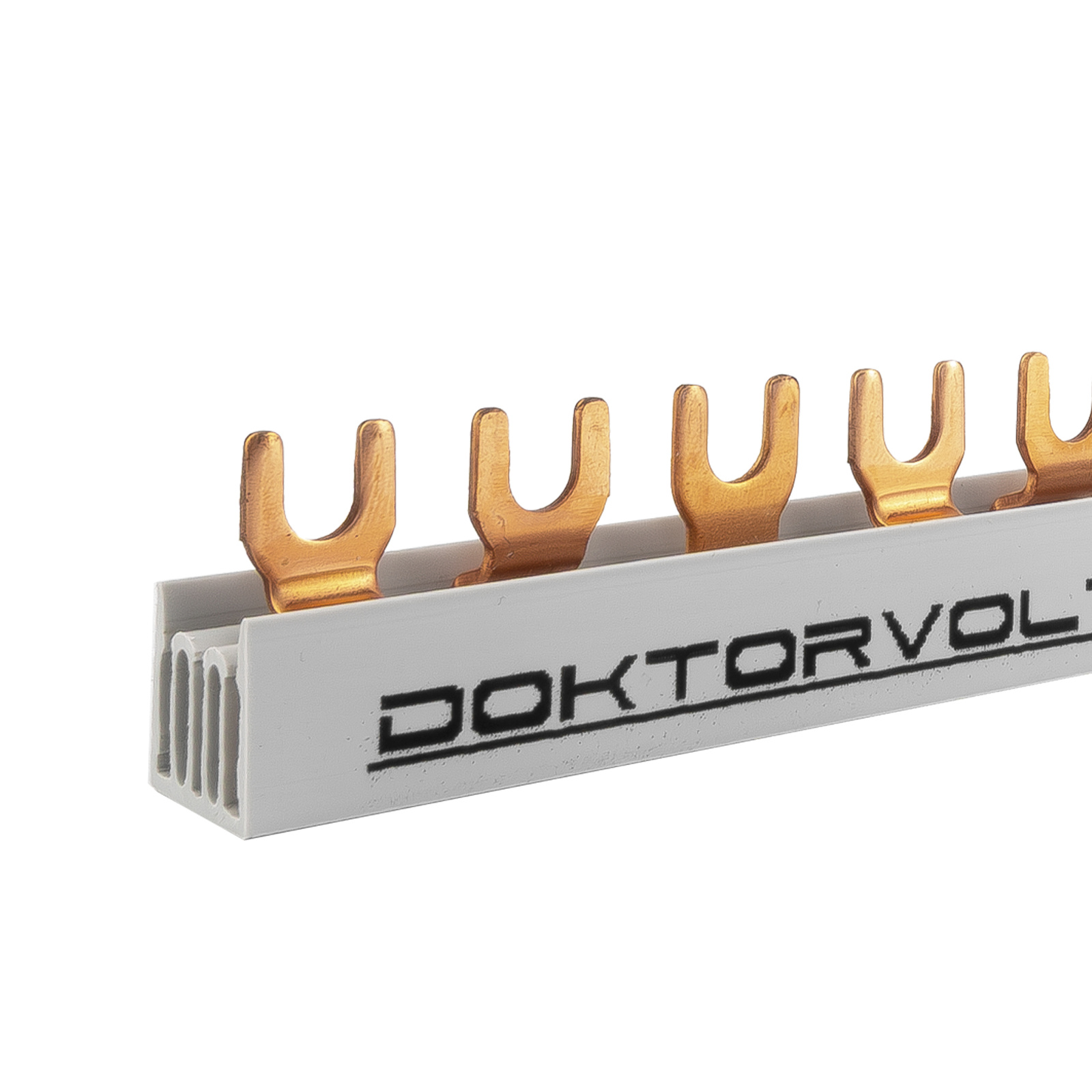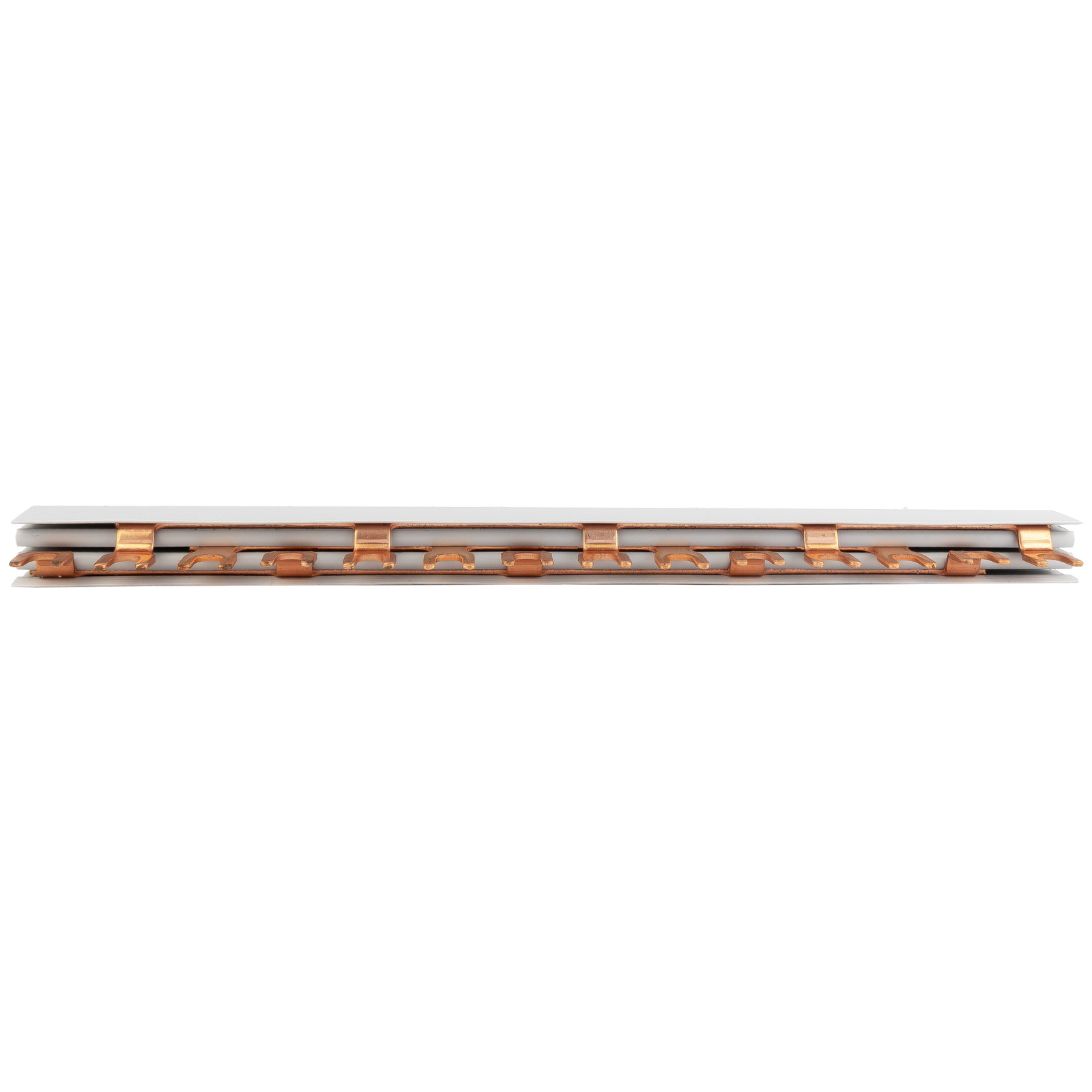 - Szyna grzebieniowa 3-fazowa o przekroju 12 mm², 14-modułowa, z prądem znamionowym 80A. Koloru białego