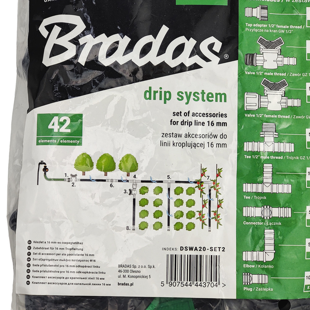 - Akcesoria do linii kroplującej BRADAS 16mm DRIP SYSTEM 3704 Zestaw akcesoriów zawierający 42 elementy: zawór przyłącze na kran trójnik łącznik kolanko zaślepka