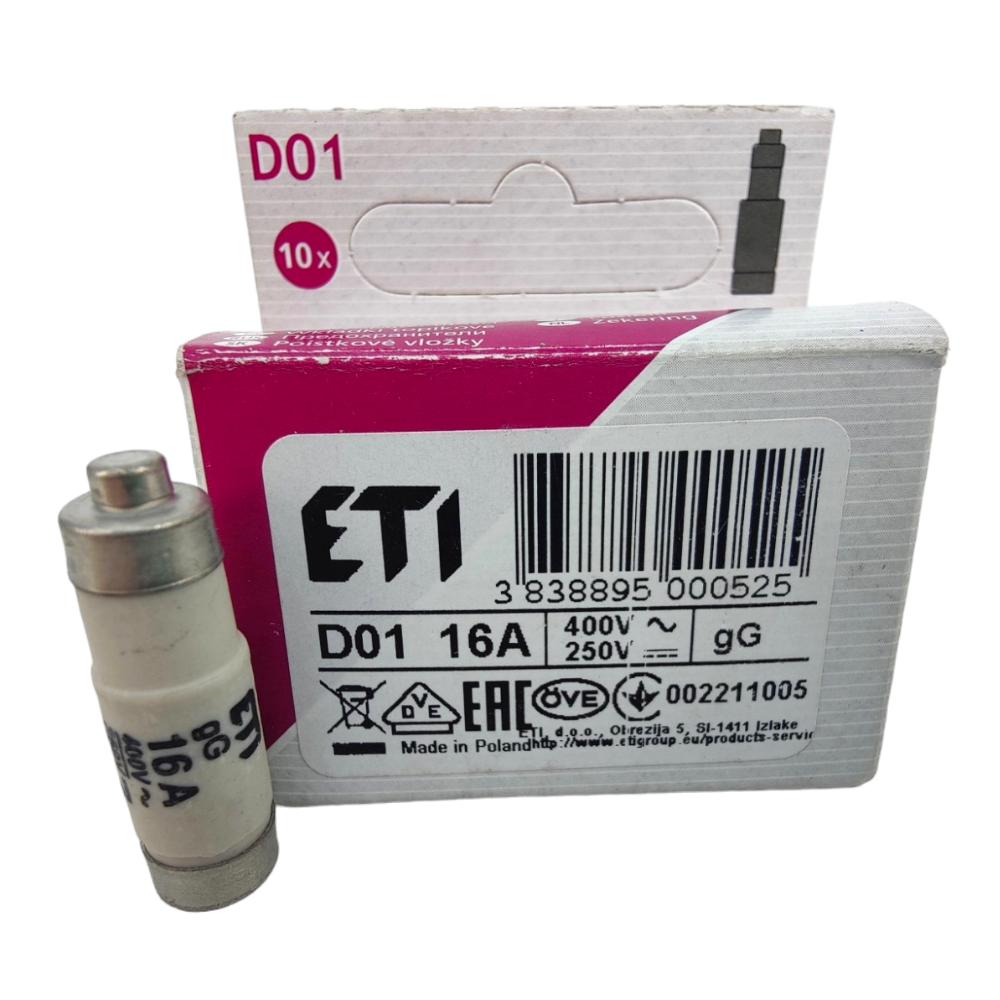 - Porcelanowa wkładka topikowa ETI D01 16A/400V – skuteczna ochrona obwodów elektrycznych przed zwarciem i przeciążeniem, zgodna z normami DIN EN