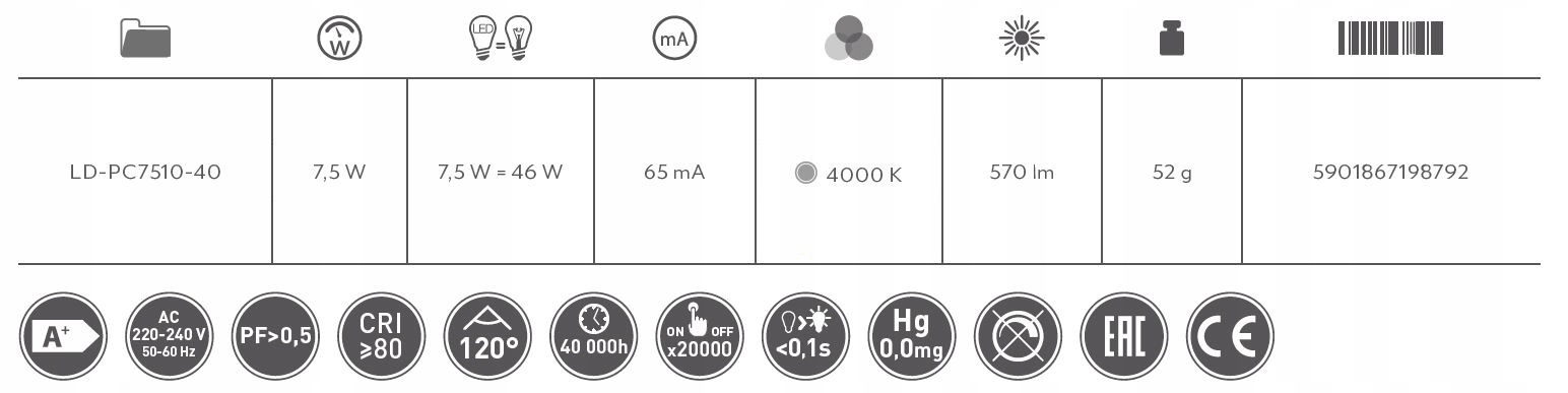 Żarówka LED GU10 7,5W 4000K biały neutralny LD-PC7510-40