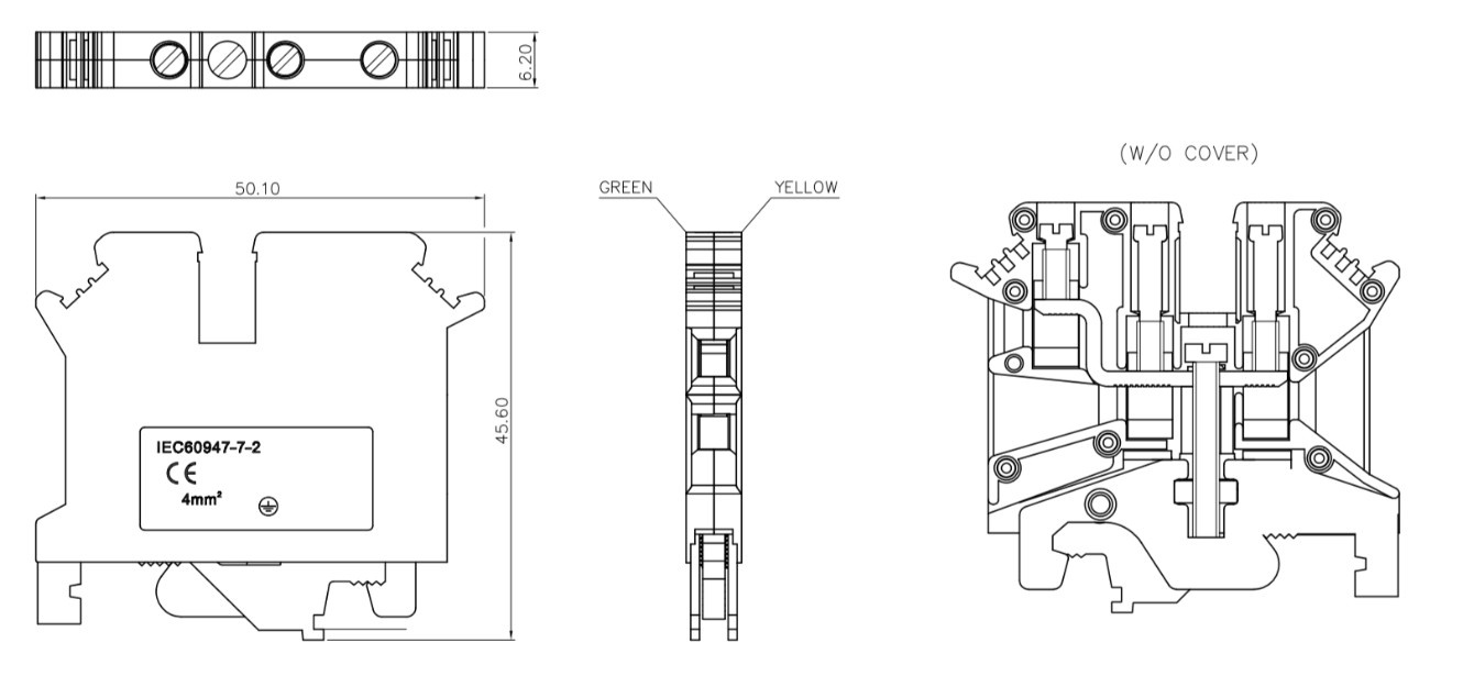 Złączka szynowa żółto-zielona PE śrubowa 4mm2 3-przewodowa 1P PC4-TW-PE-01P-1Y-00A