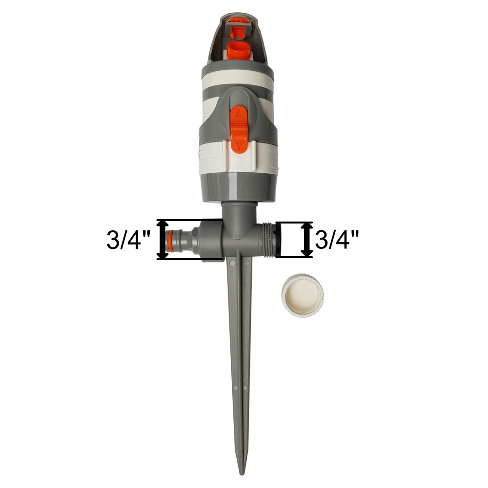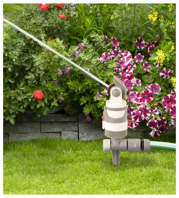 4 funkcje zraszania, regulacja odległości zraszania za pomocą obrotowej głowicy, pełny lub sektorowy obszar zraszania, manualny przełącznik pomiędzy zraszaniem sektorowym i pełnym, cicha praca, średnica nawadniania: 21m, zasięg 350m2, umieszczony na solidnym plastikowym kolcu, możliwe szeregowe połączenie z innymi zraszaczami.