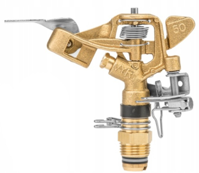 Mosiężny pulsacyjny obrotowy regulowany sektorowy zraszacz z gwintem zewnętrznym 1/2", do zamocowania na kolcu lub na statywie. Posiada stabilną konstrukcję co gwarantuje długie i niezawodne użytkowanie. Istnieje możliwość regulacji pola zraszania od 20° do 360°. Maksymalna średnica zraszania wynosi 25m.